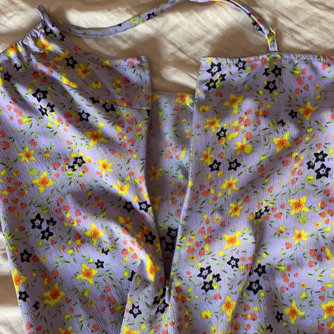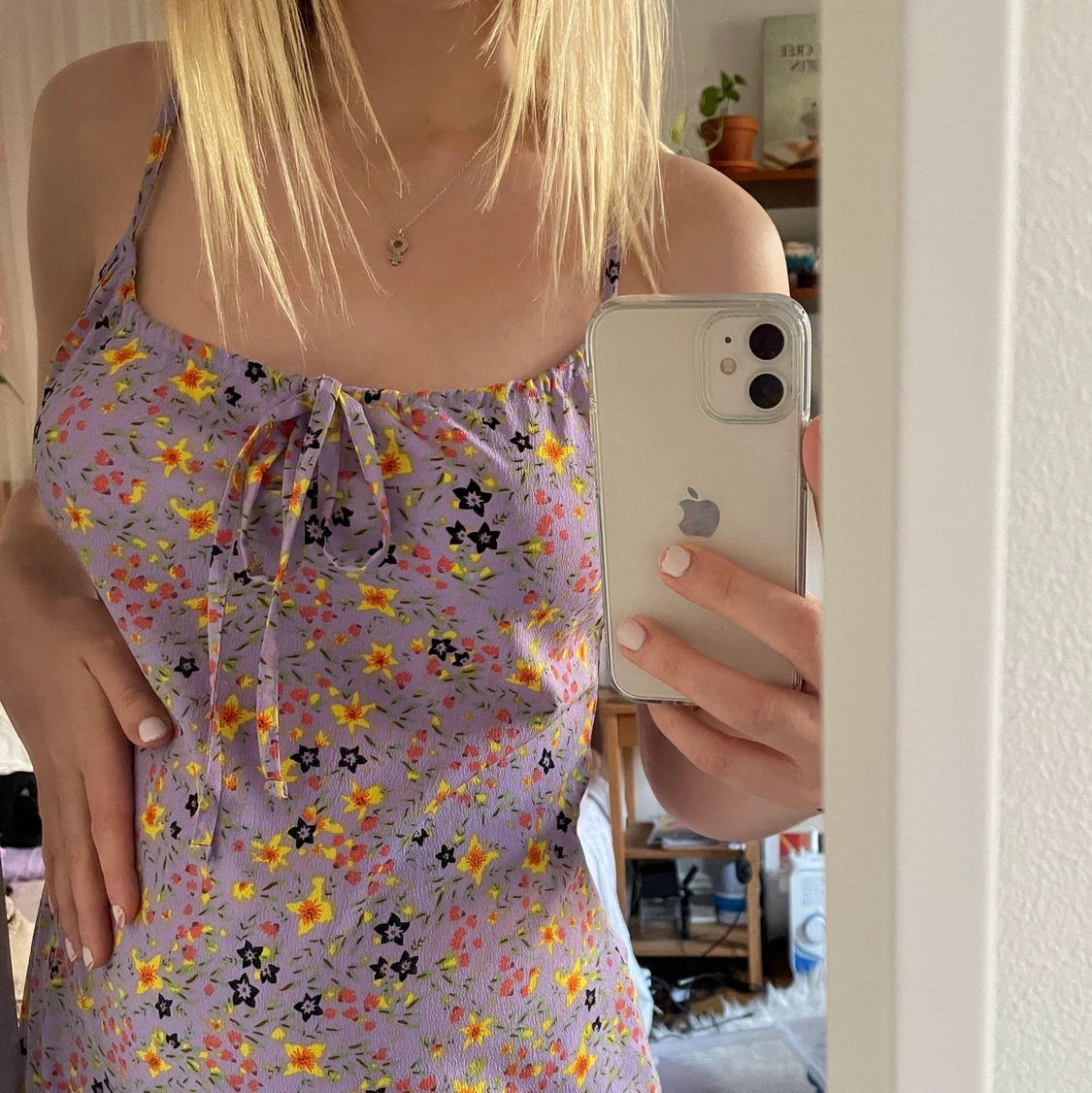 Ljuslila sommarklänning med blommigt mönster i gult, grönt, orange, brunt och svart. Den har en liten volang nertill och en rosett som knyts upptill. Köpt för några år sedan men har endast använt några gånger. Möts i Stockholm annars betalar köpare frakt.