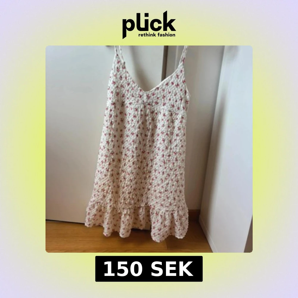 Supersöt vit klänning med små rosa blommor och volang nertill. Klänningen har smala axelband och en lätt v-ringning. Perfekt för varma dagar och har en luftig, flowy passform. Materialet känns som bomull och är riktigt bekvämt.