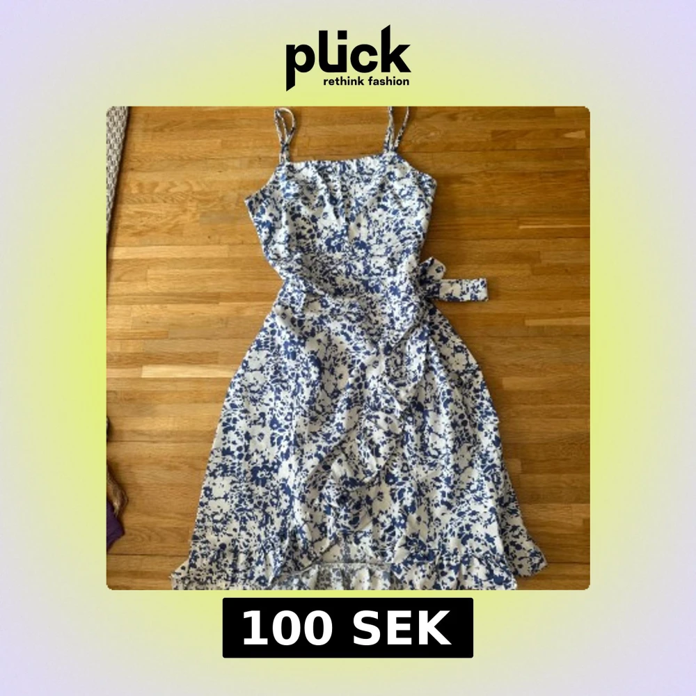Supersöt vit och blå omlottklänning med smala axelband och volangkant nertill. Klänningen har ett blommigt mönster, knyt i midjan och dragkedja i sidan. Perfekt för varma dagar och ger en fräsch sommarkänsla.