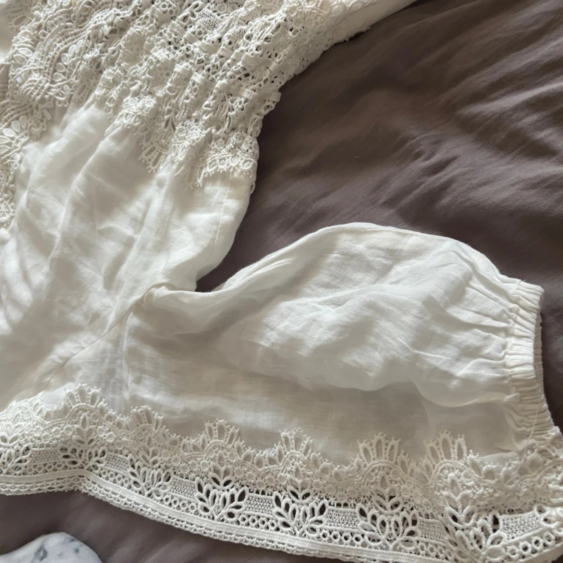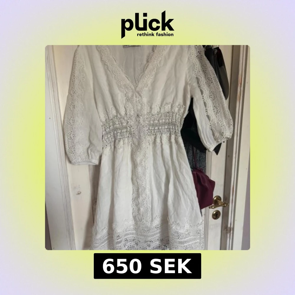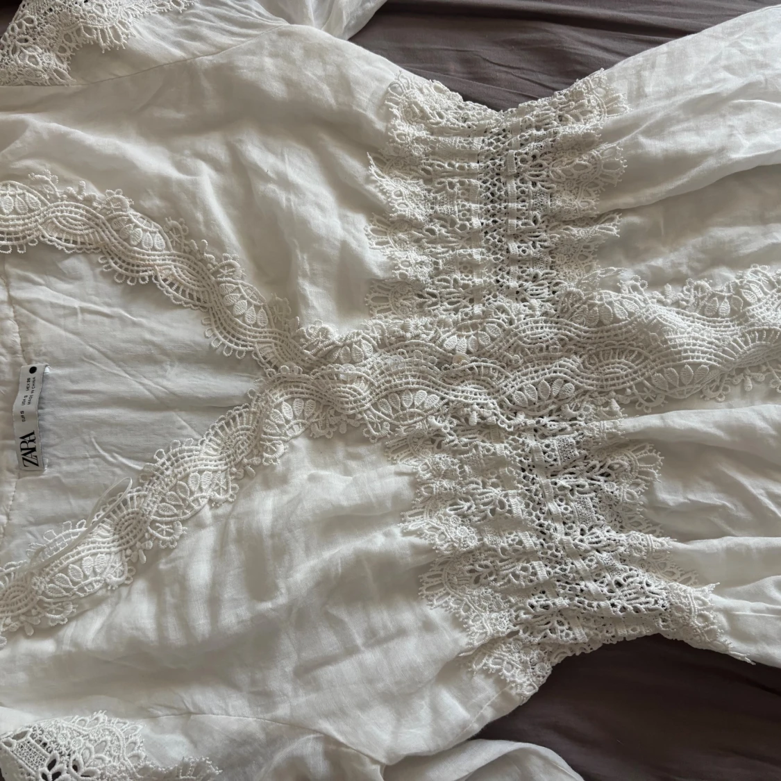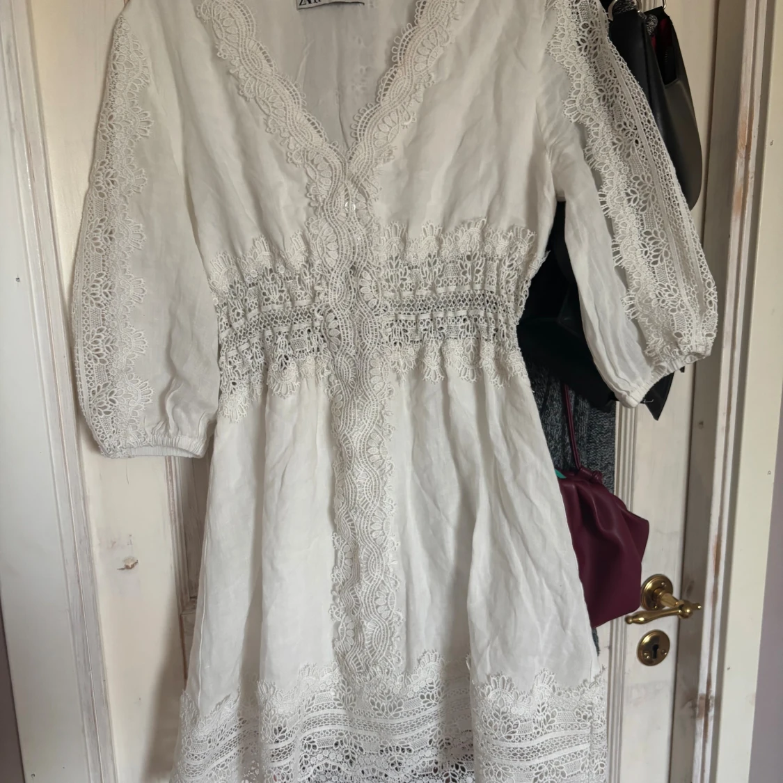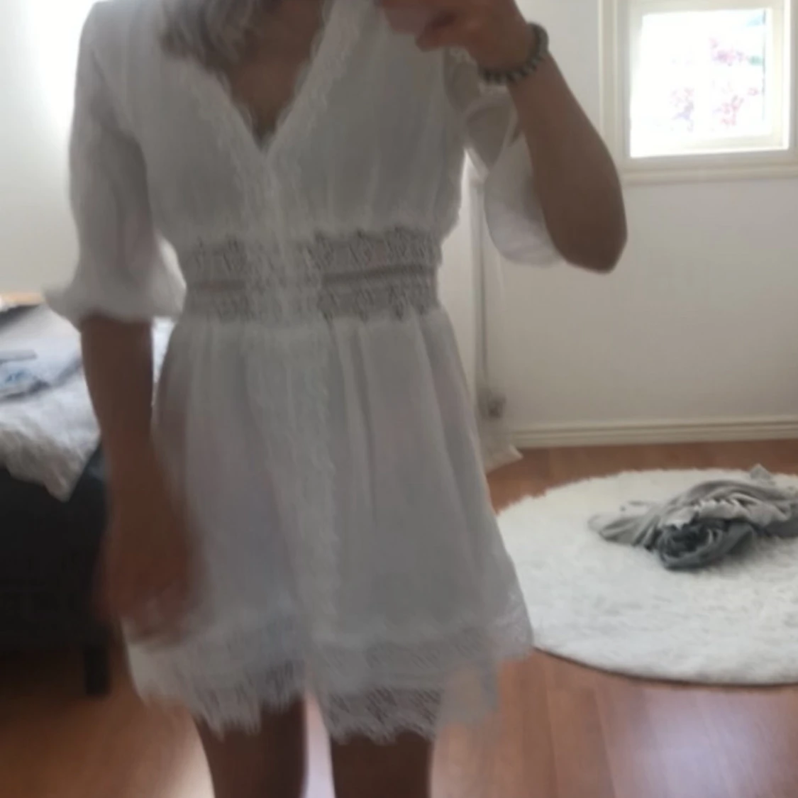 Superfin vit kortklänning från Zara med v-ringning och vackra spetsdetaljer längs ärmar, midja och nederkant. Klänningen har trekvartsärmar och är gjord i ett lätt material som känns luftigt och somrigt. Perfekt för student eller skolavslutning! Endast använd en gång så superfint skick , säljs inte längre