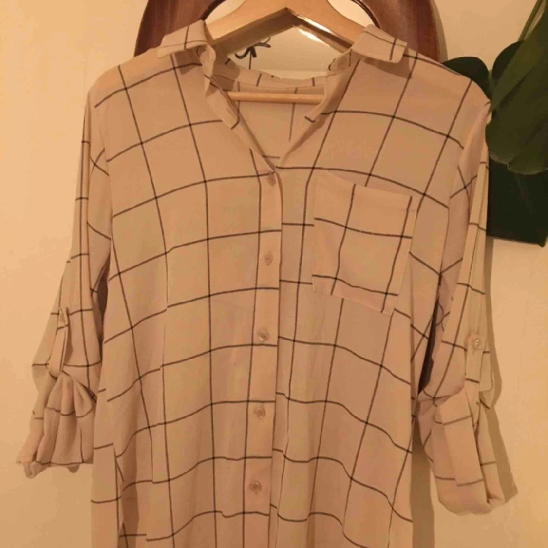 Superhärlig blus/klänning i en ljus beige-aktig färg! Står ej märke eller storlek, men väldigt fin kvalité och härligt tyg i 100% polyester. Storleken skulle jag uppskatta som S, men passar både mindre lite lösare och större lite mer åtsittande.