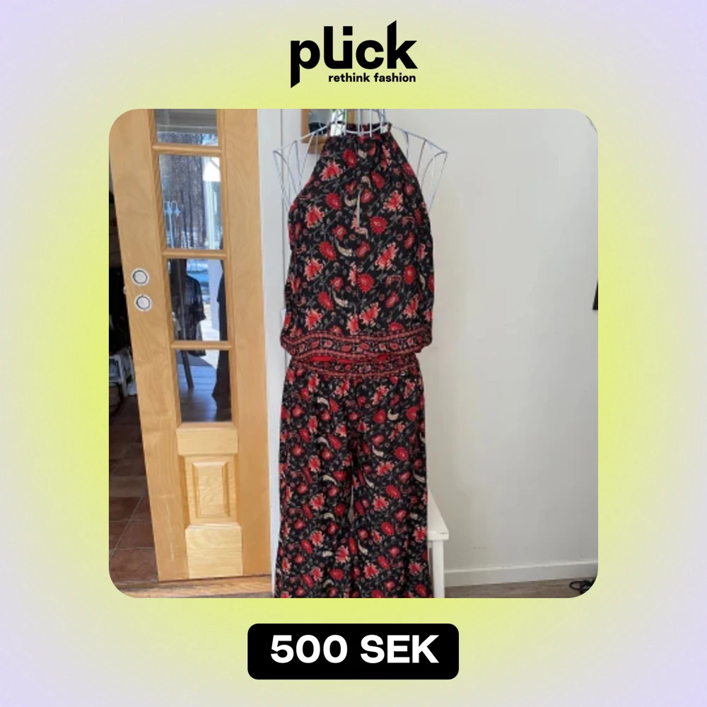Öppen rygg till lång ner i ryggen. Ledigt och Bohemisk jumpsuit i siden, superfin fall och halterneck. Storlek uppskattas till M men passar även L och eftersom den är stretchig i midjan. Inköpt i Spanien