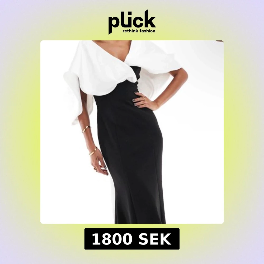 Elegant svart balklänning med stora vita volangdetaljer och öppen rygg. Perfekt för en glamorös kväll.