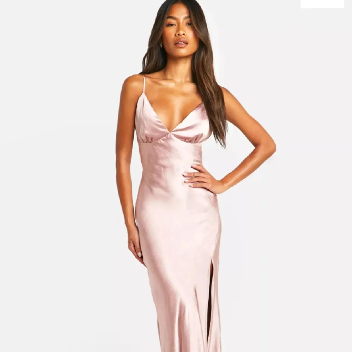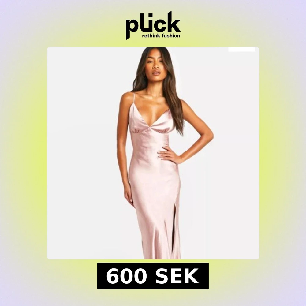 Säljer en satin klänning med smala axelband, djup v-ringning och hög slits framtill. Klänningen har en figurnära passform
