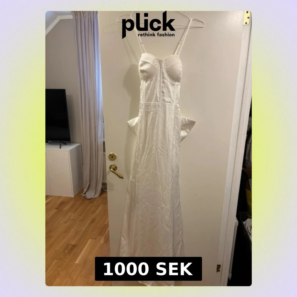 Supersnygg vit långklänning från Boohoo i glansigt satinliknande material. Klänningen har smala axelband, markerad byst och en stor rosett bak som ger en extra wow-effekt. Perfekt för dig som vill sticka ut och känna dig extra glam.