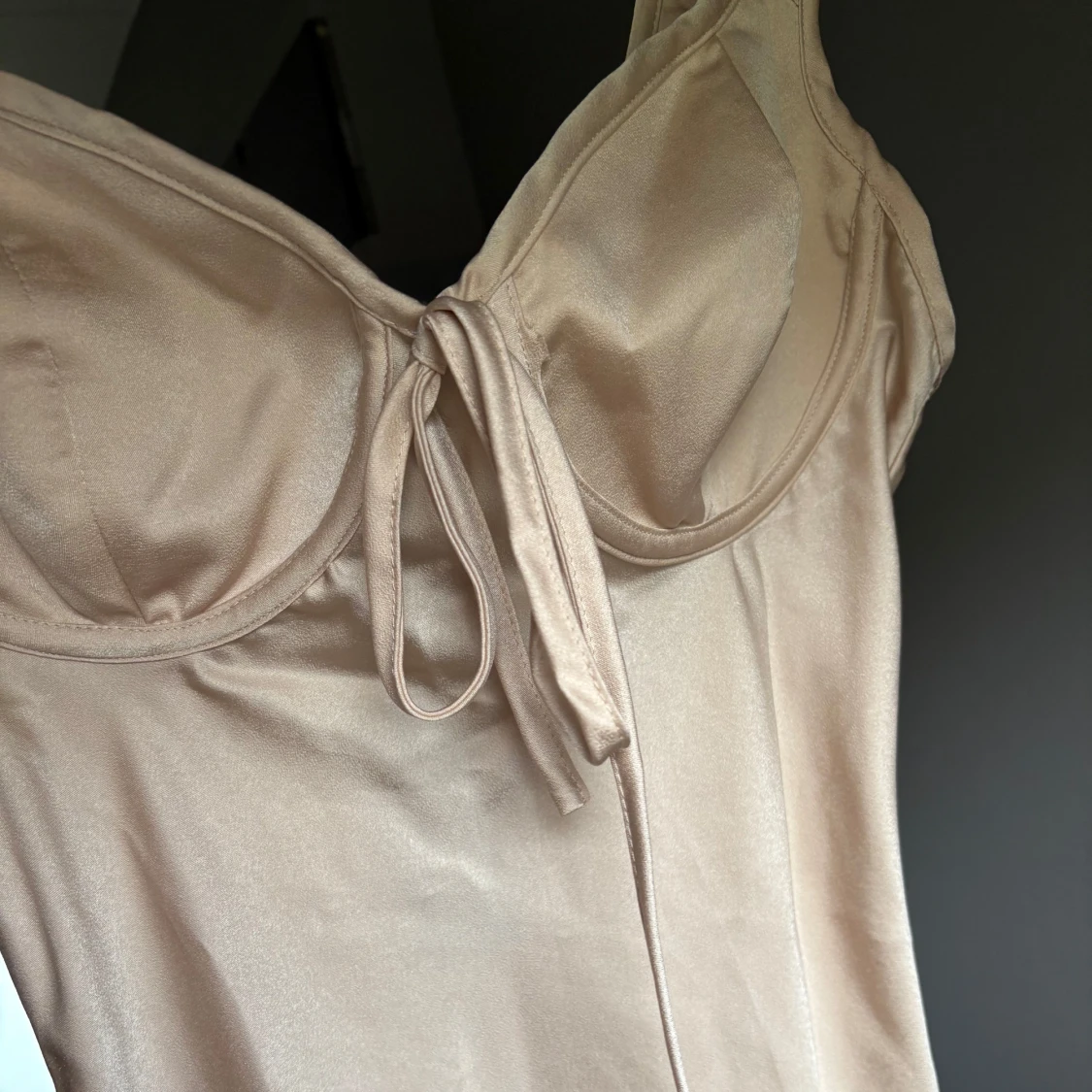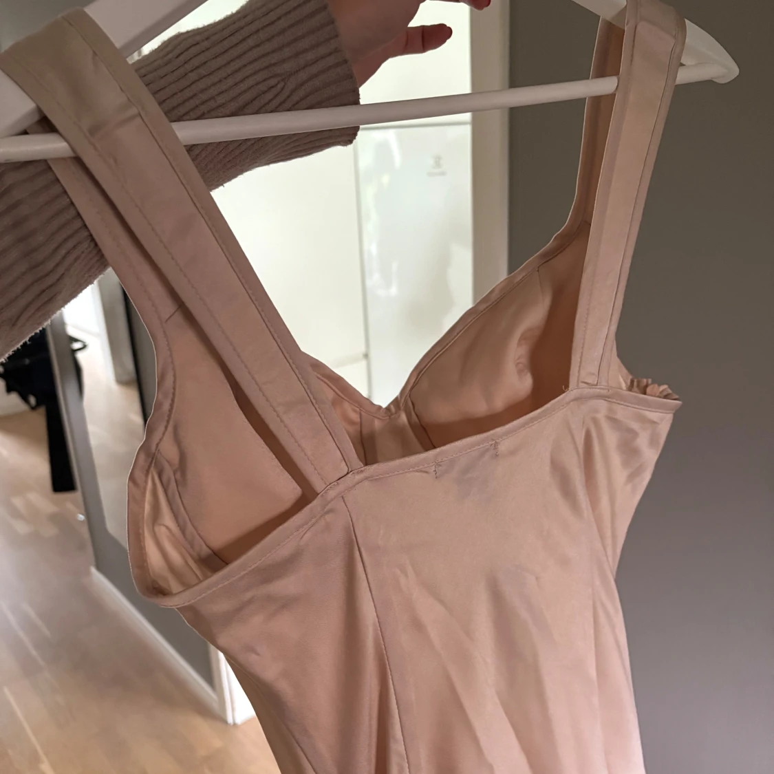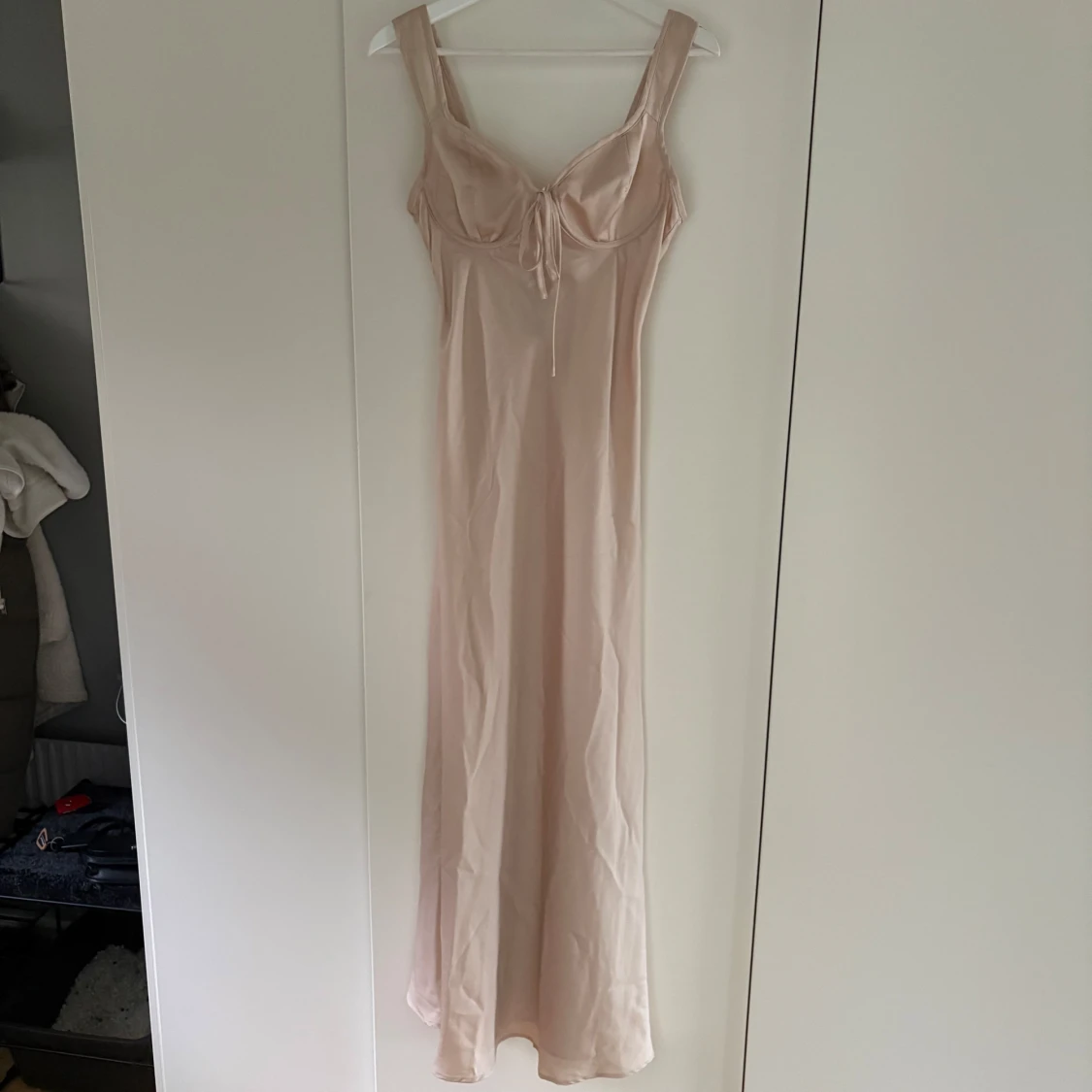 Säljer en långklänning i champagnefärgad satin med breda axelband och knyt fram vid bysten. Klänningen är helt oanvänd från Boohoo. Lapp finns kvar. Nypris ca 600kr. Helt oanvänd. Rättvis bild på färgen syns på andra bilden.
