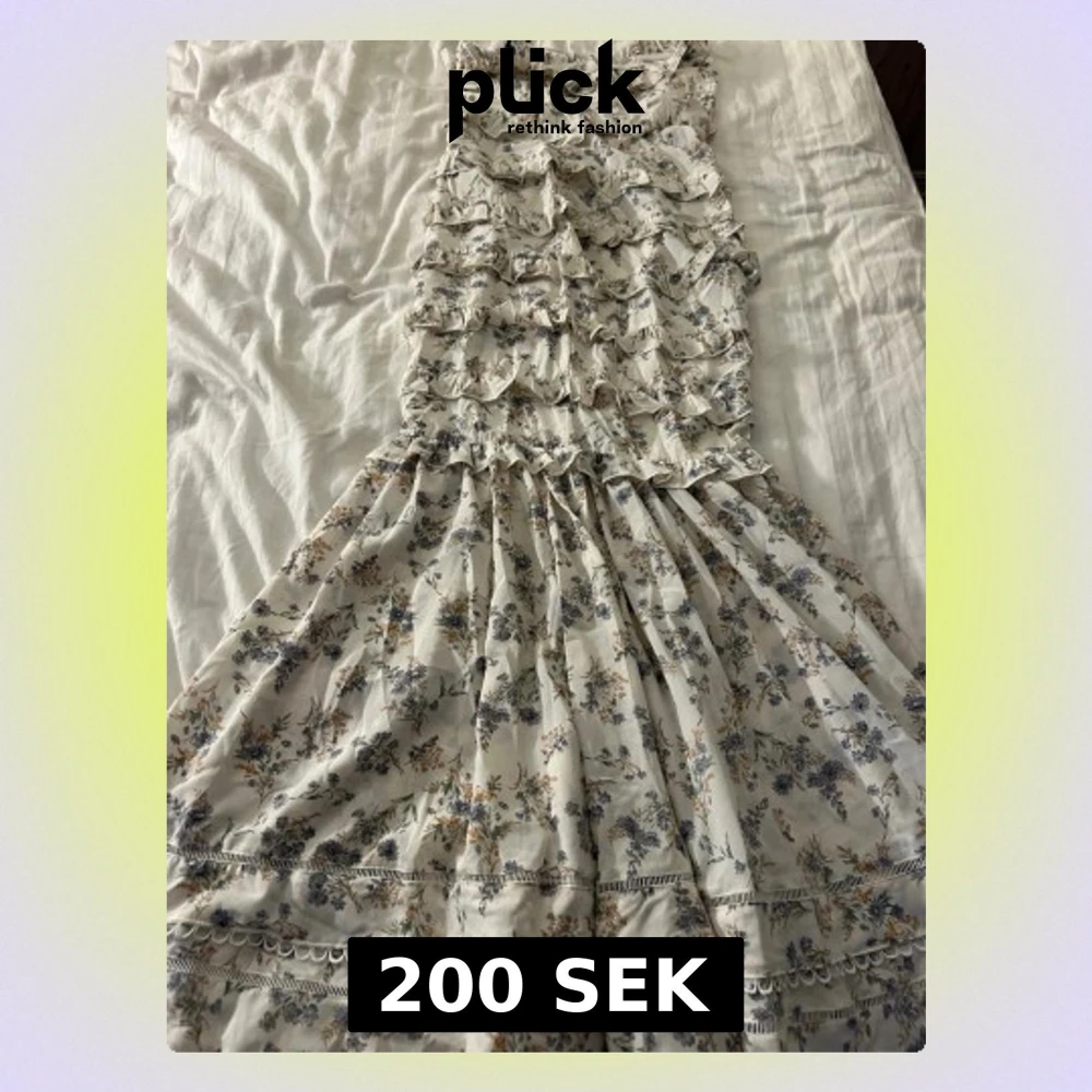Långklänning från Boohoo i vit bas med blå och beige blommönster. Klänningen har volangdetaljer, dragkedja i ryggen och inga axelband. Har en i storlek 40 och en i storlek 38 därpå två annonser