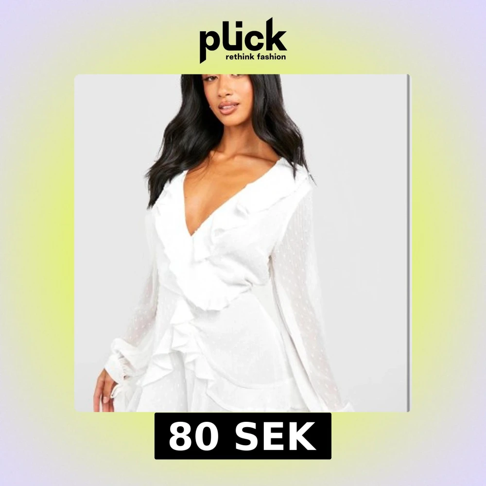Säljer en elegant vit klänning från Boohoo med volangdetaljer. Klänningen har långa ärmar och en v-ringad design som ger en stilren look. Perfekt för sommaren eller student. Aldrig andvänd. Skulle att den har storlek S/M☺️