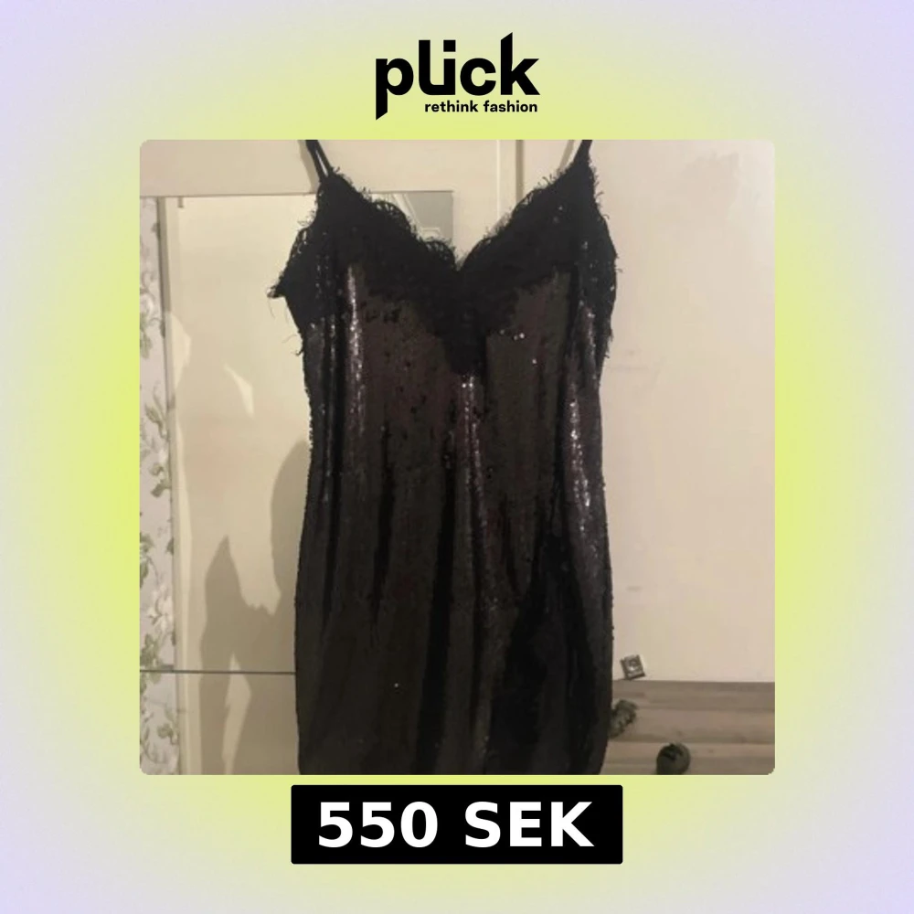 Supersnygg svart kort klänning med paljetter och spetsdetaljer vid halsringning och nederkant. Justerbara tunna axelband för perfekt passform. Perfekt för dig som vill sticka ut med en glittrig look och älskar detaljer som spets och paljetter. Klänningen är helt ny.