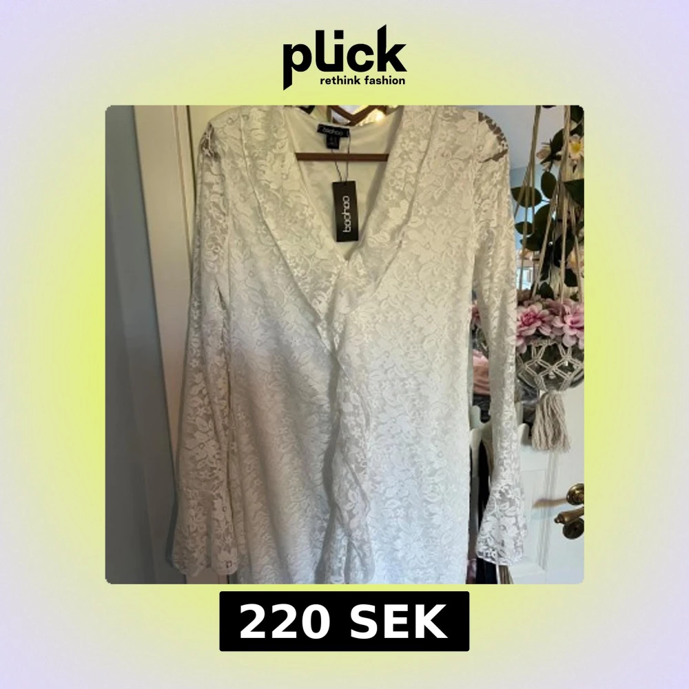 Säljer en vit spetsklänning från Boohoo med v-ringning och långa ärmar. Klänningen har ett romantiskt blommönster i spets och är i minilängd. Perfekt för dig som vill ha en feminin och elegant look. Klänningen är något liten i storlek skulle säga 42/44. Den är lite för kort för mig som är 179