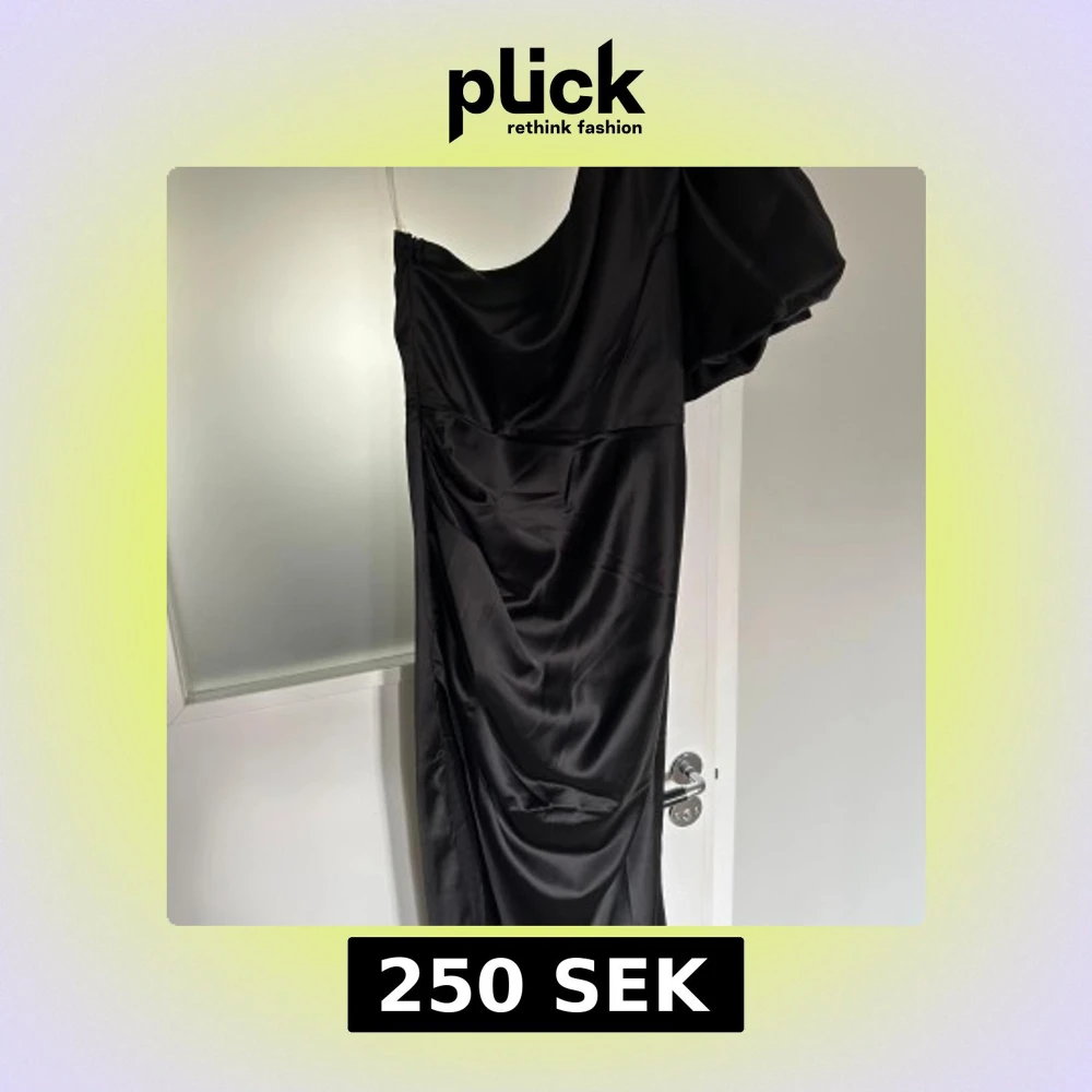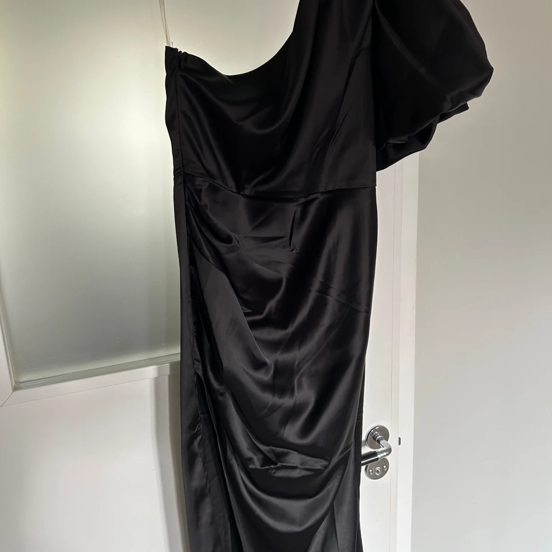 Svart one-shoulder balklänning med slits och puffärm, använd en gång.
