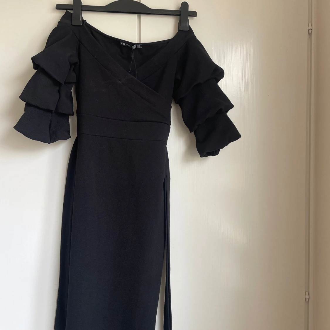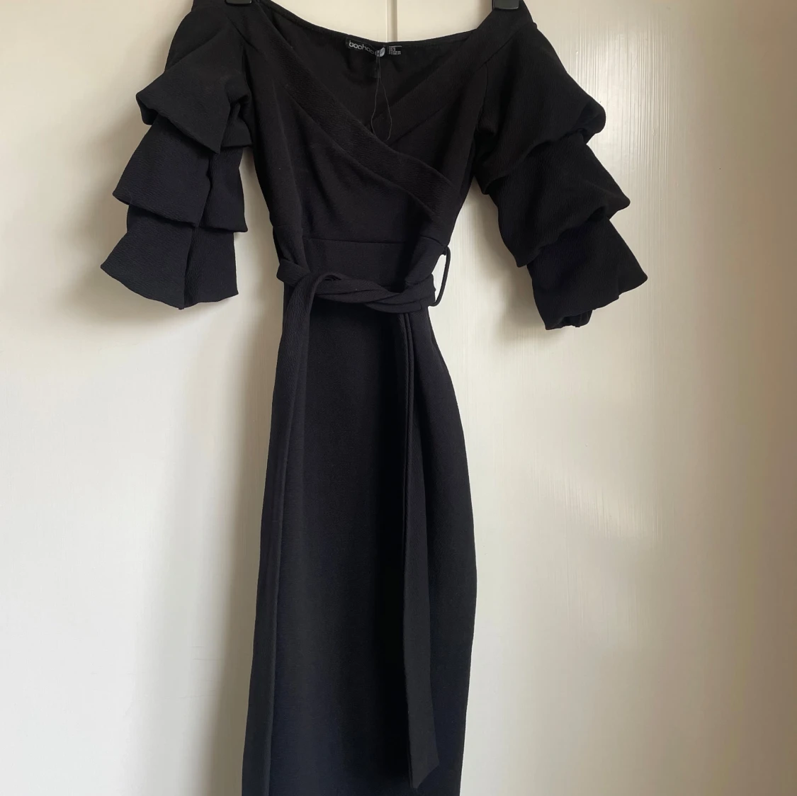 Omlottklänning med trekvartsärm i flera volanger. Klänningen har omlottliv och ett matchande bälte i midjan. Från booho i storlek 36.