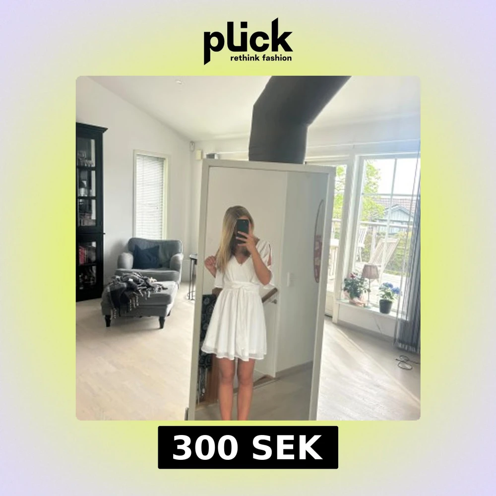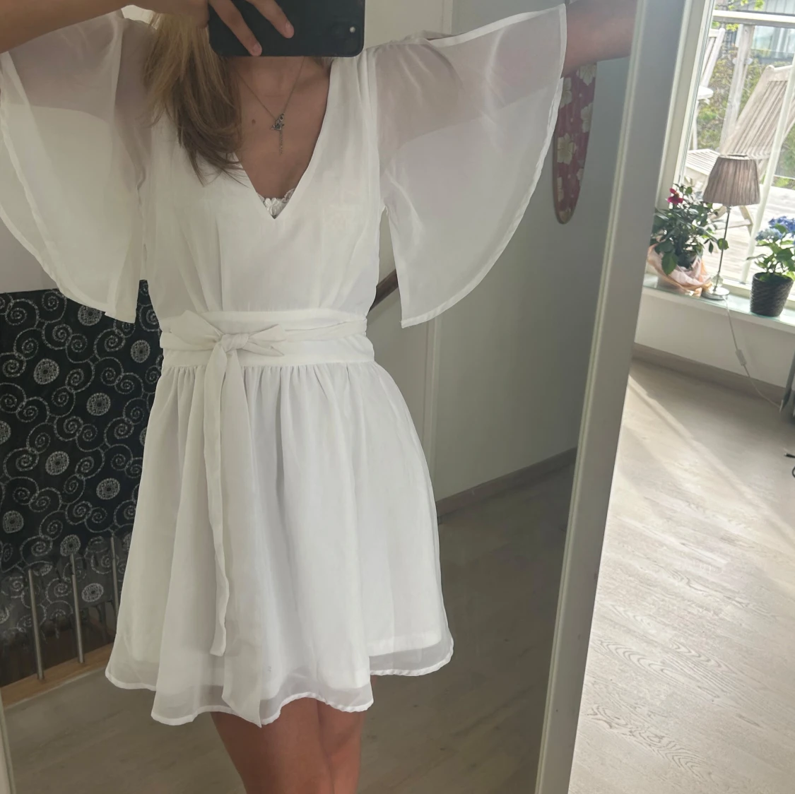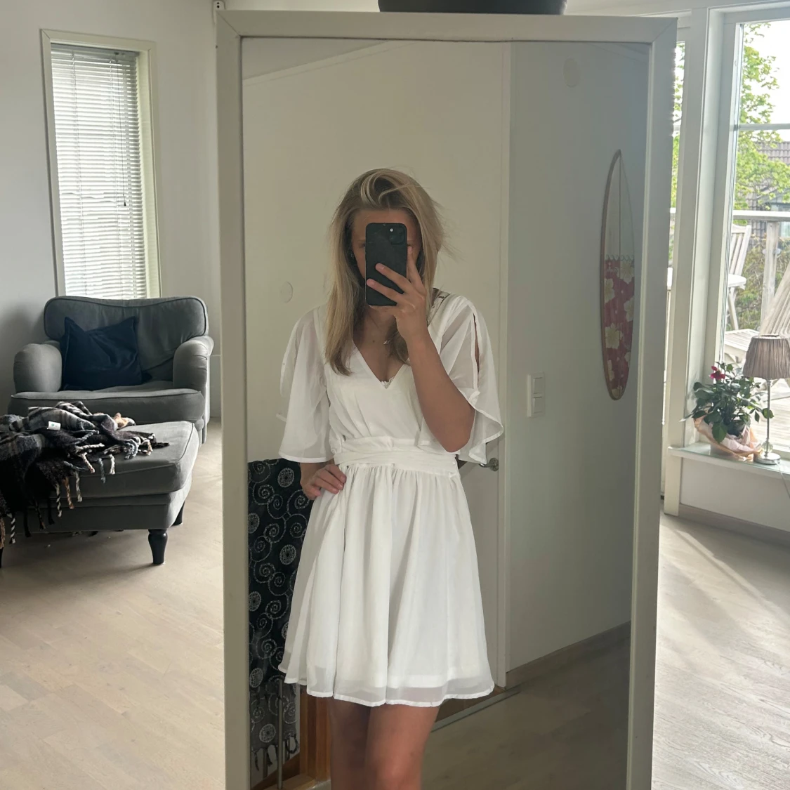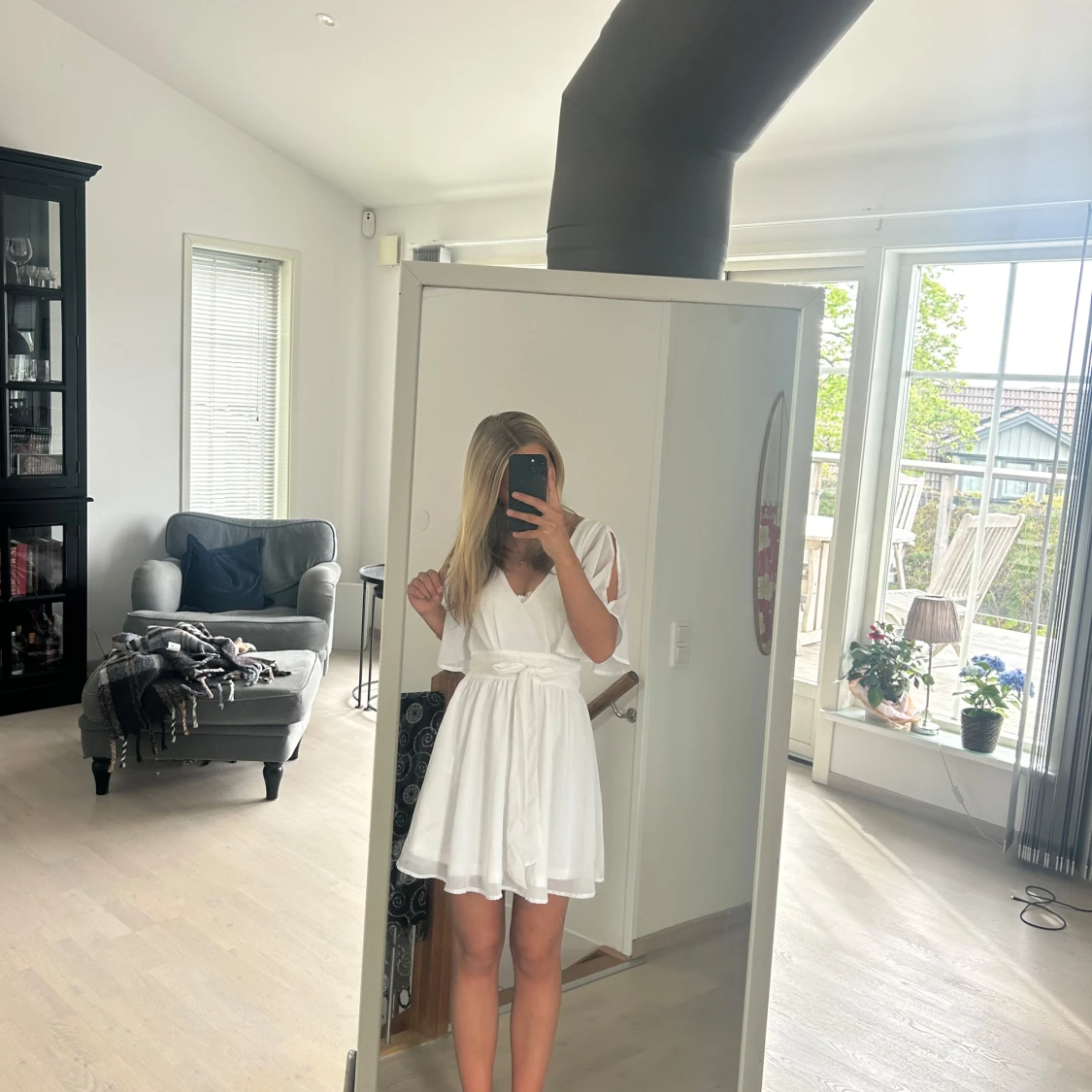 Säljer en superfin vit omlottklänning med knyt i midjan och v-ringning. Endast använd en gång på avslutning i 9an🥰