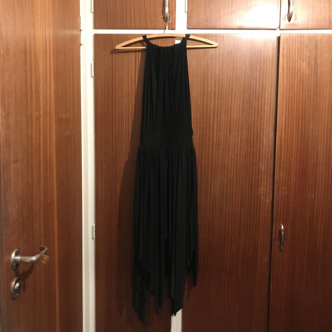 Svart assymmetrisk klänning med knyt i sidorna och öppen under armarna. Aldrig använd. Säljs pga för stor storlek.