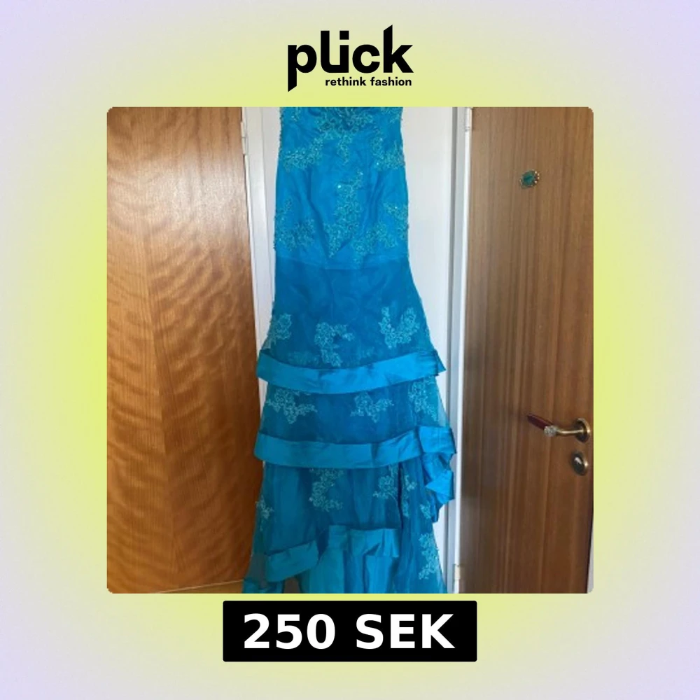 Säljer en turkos långklänning med vackra blommiga broderier och paljettdetaljer. Klänningen har ett axelband där man kan sätta dom blommorna på, volangdetaljer och snörning i ryggen för justerbar passform. Perfekt för bal eller festliga tillfällen.