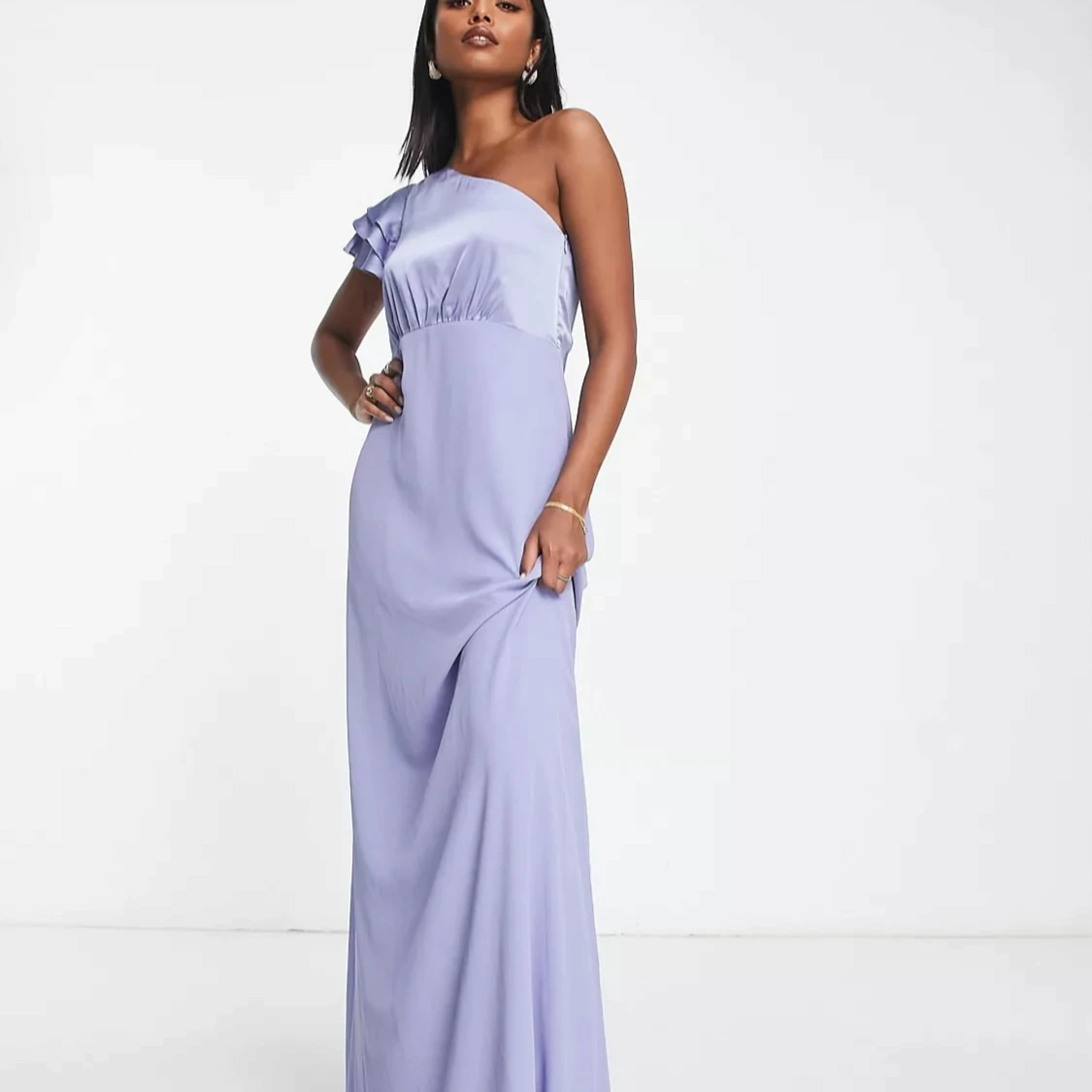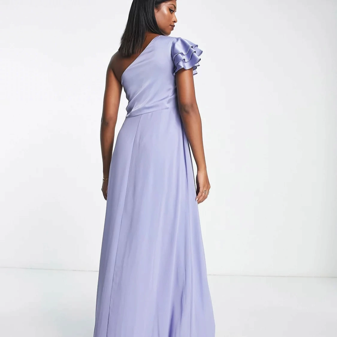 Så elegant ljusblå/lila långklänning med oneshoulder och volang på axeln. Perfekt för bal eller bröllop. Oanvänd då jag valde en annan🩵