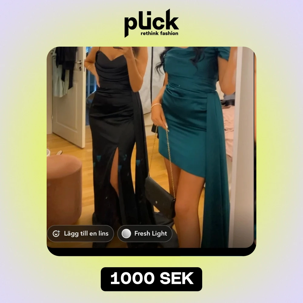 Två eleganta klänningar till salu! Den svarta klänningen är en långklänning med slits och axelbandslös design, perfekt för fest. Den gröna klänningen är kort med en offshoulder-stil och har en vacker drapering på sidan. Båda klänningarna är i mycket bra skick och passar perfekt för en glamorös kväll.
