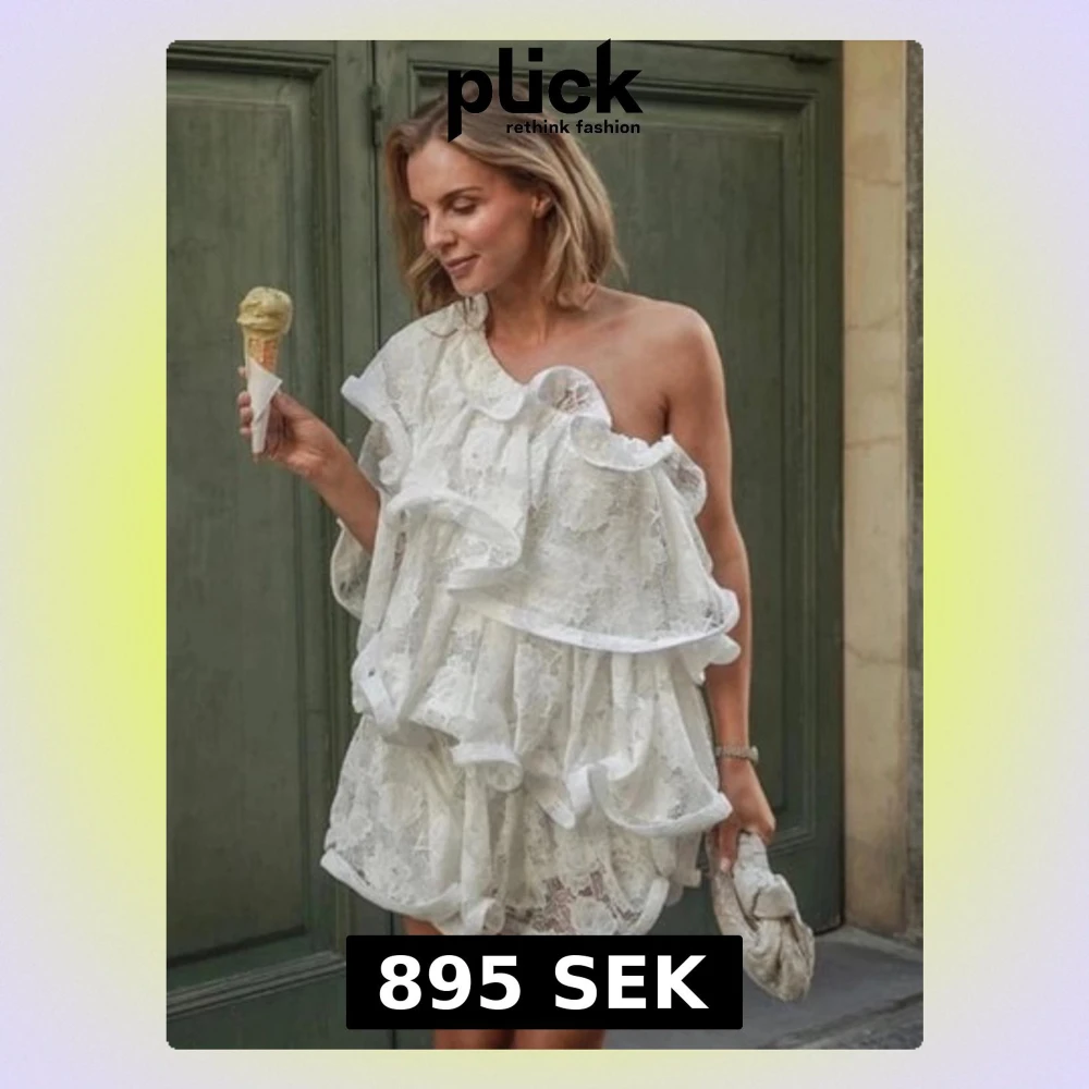 Superfin vit kort klänning i spets med stora volanger och oneshoulder-design. Säljer denna SUPER vackra klänningen från Lojsans kollektion med NAKD, säljer den eftersom jag hittat en annan klänning till studenten som jag gillar mycket mer! Jag bär vanligtvis S och den sitter bra på mig. Kan skicka egna bilder vid frågan.