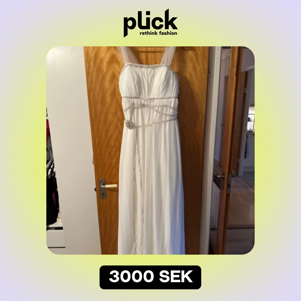 Säljer min brudklänning.Den är fantastiskt fin men har lite skavanker efter en lång dag.Det glittriga bandet har trissat upp sig på ett par ställen är du händig kan du fixa detta.Extra band medföljer.Även en sjal,väska och garderob.Behövs tvättas.