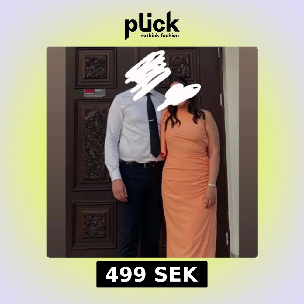 Säljer en snygg långklänning i en fräsch orange färg. Klänningen har one shoulder-design med draperad detalj på sidan och en elegant, figurnära passform. Perfekt för sommarens tillställningar och fester. Använd 1 gång på bröllop! Kika gärna på flera av mina plagg/skor på min profil 🌸
