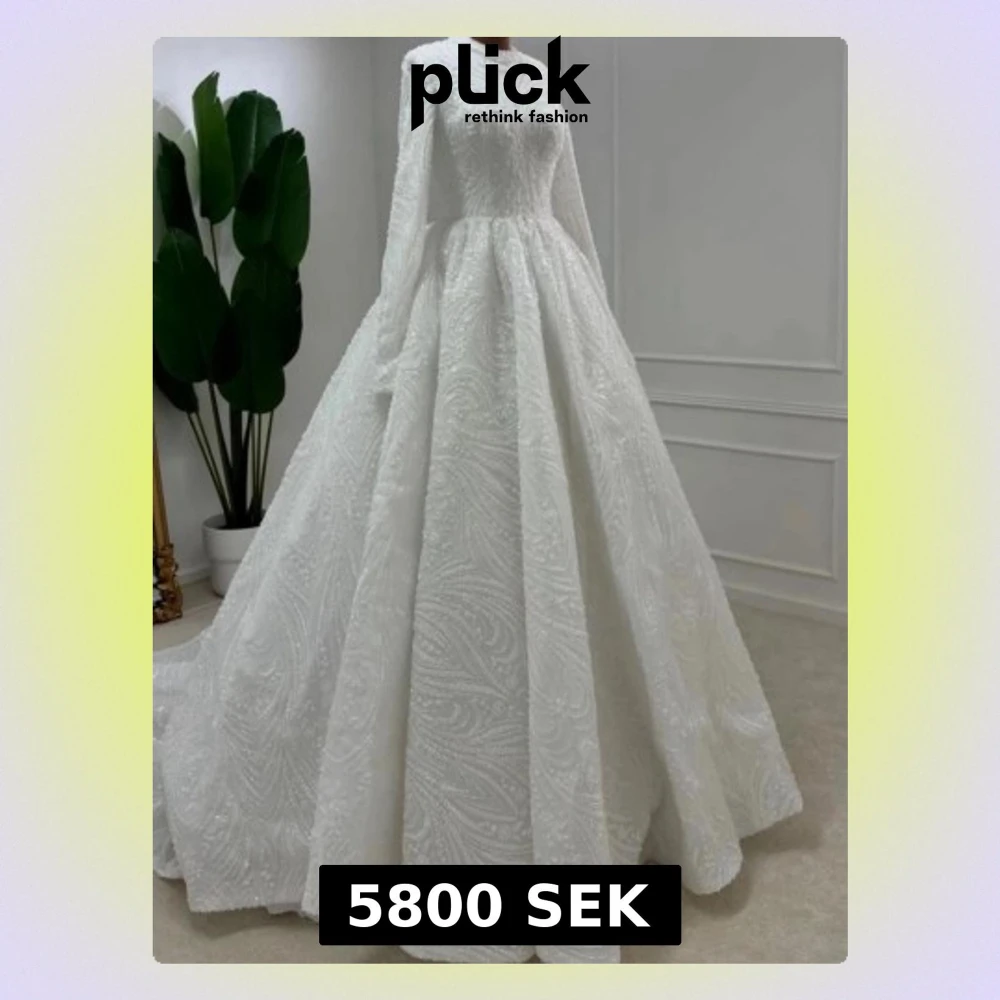 Bröllopsklänning med glittriga paljettdetaljer och vackert mönster. Klänningen har lång ärm, hög hals och en vid kjol som ger en klassisk siluett.