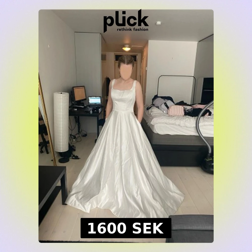En -no branded- brudklänning i storlek 6 (88cm bröst, 70cm midja, 96cm höfter, 150cm framtill längd) I färgen ivory white, med fickor, bröstkoppar, ett blixtlås baktill. Inga fläckar eller skador. Precis som nytt skick. Säljs tillsammans med en A-formad underkjol.