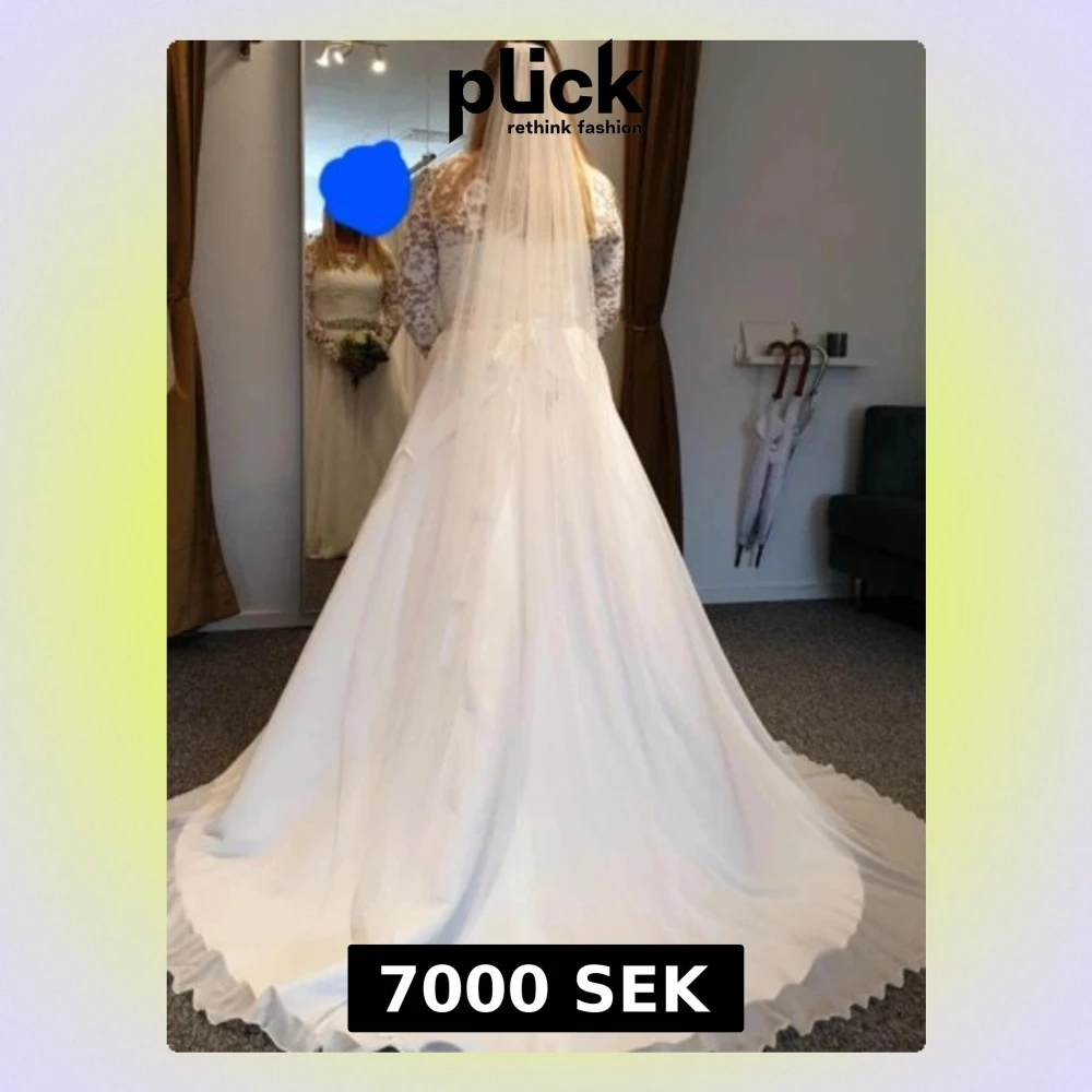Säljer en vit brudklänning med vackra spetsdetaljer på överdelen och långa ärmar. Kjolen är vid och svepande med volangkant. Midjan pryds av ett glittrigt strassbälte som ger extra lyxig känsla. Går att ta av. Perfekt för dig som söker en vintage feeling på din bröllopsdag.