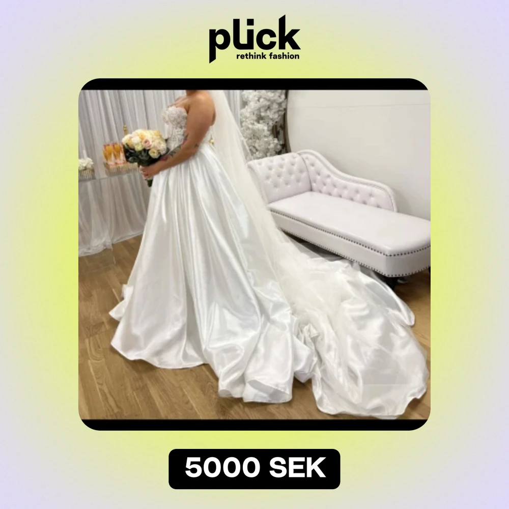 Brudklänning köpt från Stockholm brud och fest stolek 36 men passar även en 40-42 för det finns korsett i ryggen och kedja använd några timmar säljes för 5000 kronor pris kan diskuteras det ingår slöja i priset men ingen underkjol