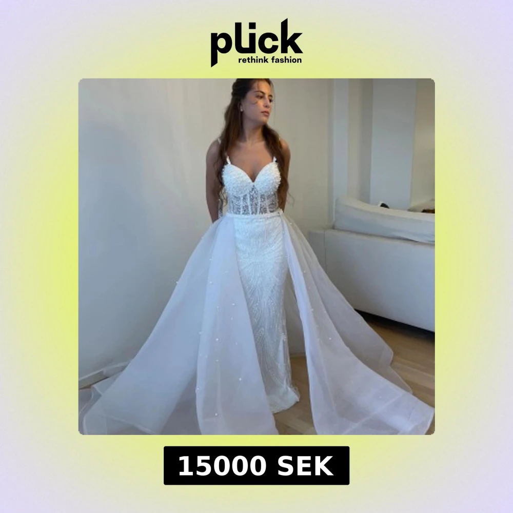 Helt ny med etikett. Ångrade mitt köp av denna brudklänning med glittrande detaljer och pärlor. Klänningen har axelband med pärlor och en voluminös kjol. Den är dekorerad med pärlor och har en korsettliknande överdel som ger en smickrande passform. Ny pris 22.000kr.