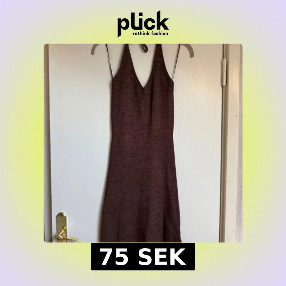 Säljer en brun klänning med snygg v-ringning. Klänningen har knyt i nacken och är ärmlös, vilket ger en cool och enkel look. Materialet är mjukt och har en lätt struktur, perfekt för varma dagar.
