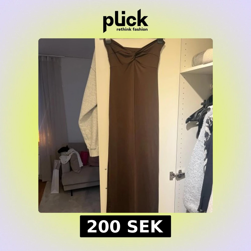 Säljer en brun axelbandslös långklänning med twistad detalj vid bysten. Klänningen har en elegant och enkel design med öppen rygg