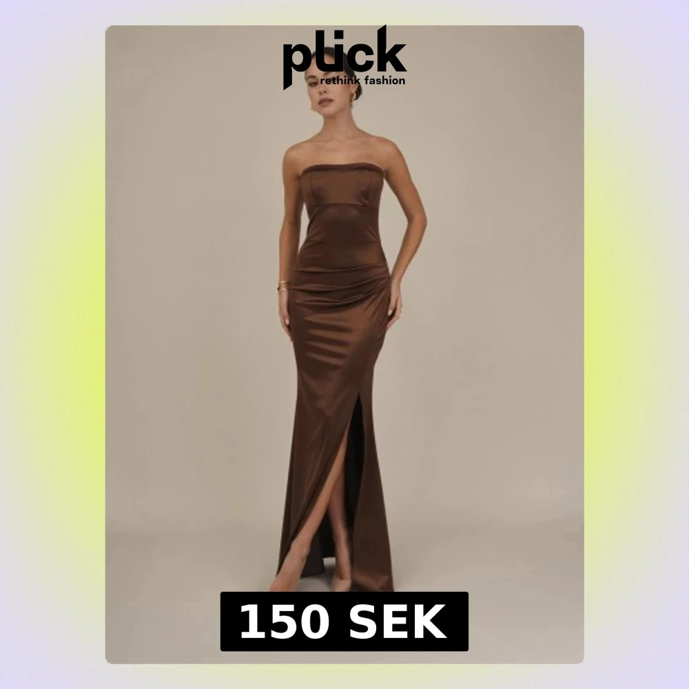 Snygg brun axelbandslös långklänning i satinliknande material. Klänningen har en figurnära passform och en hög slits framtill som ger en elegant look. Perfekt för dig som vill sticka ut med en stilren och trendig outfit.