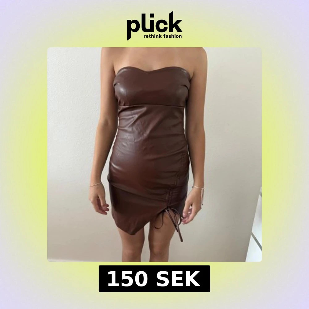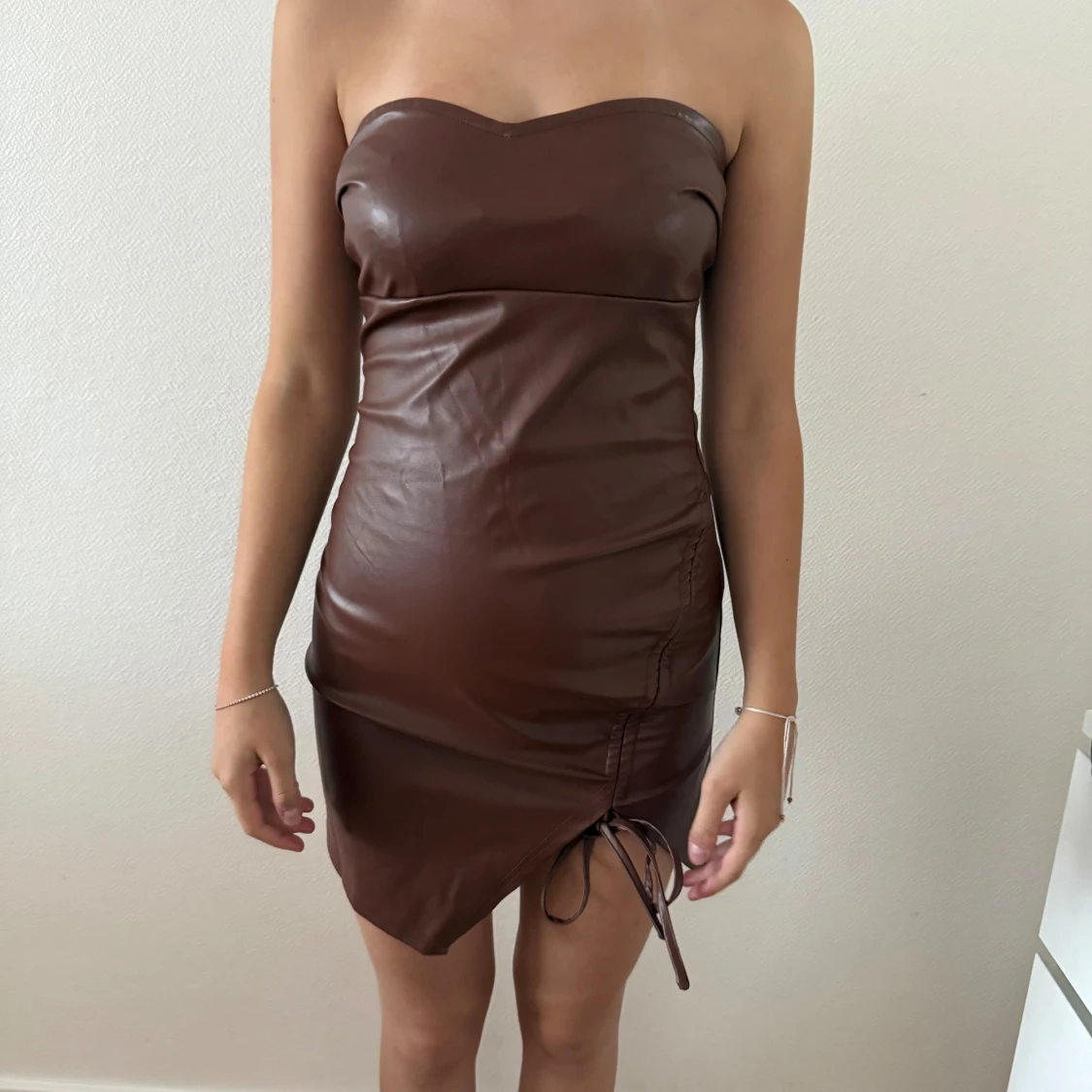 Snygg brun axelbandslös kortklänning i skinnimitation med snörningsdetalj på sidan. Klänningen har en tight passform och asymmetrisk nederkant som ger en cool look. Perfekt för dig som vill sticka ut med en trendig och edgy stil.