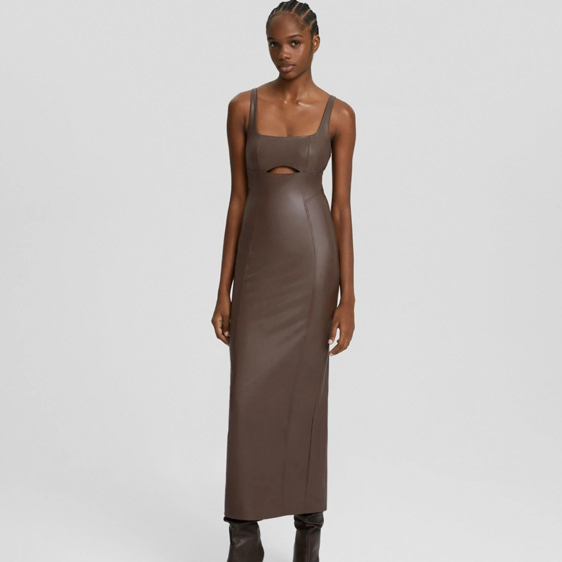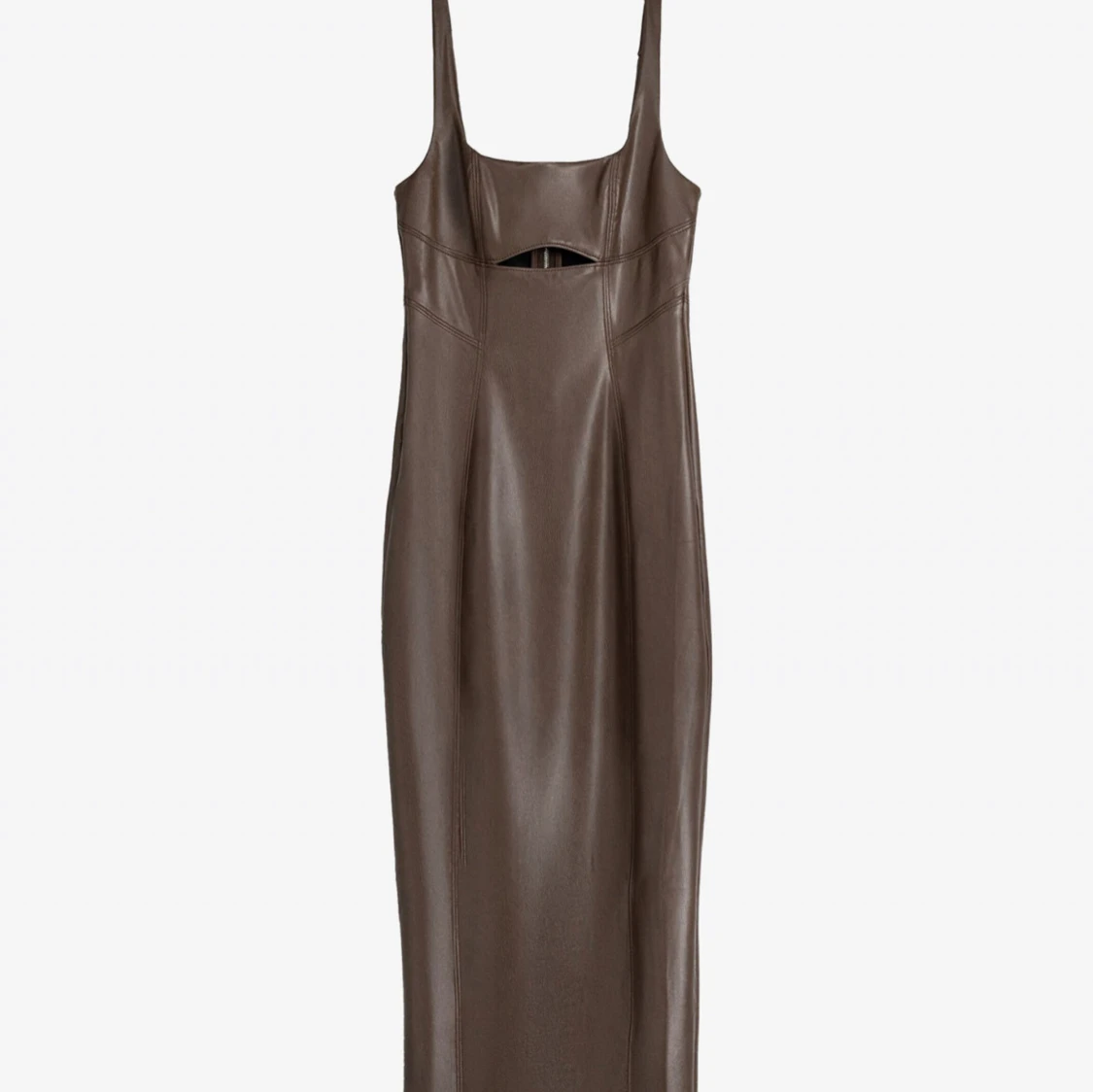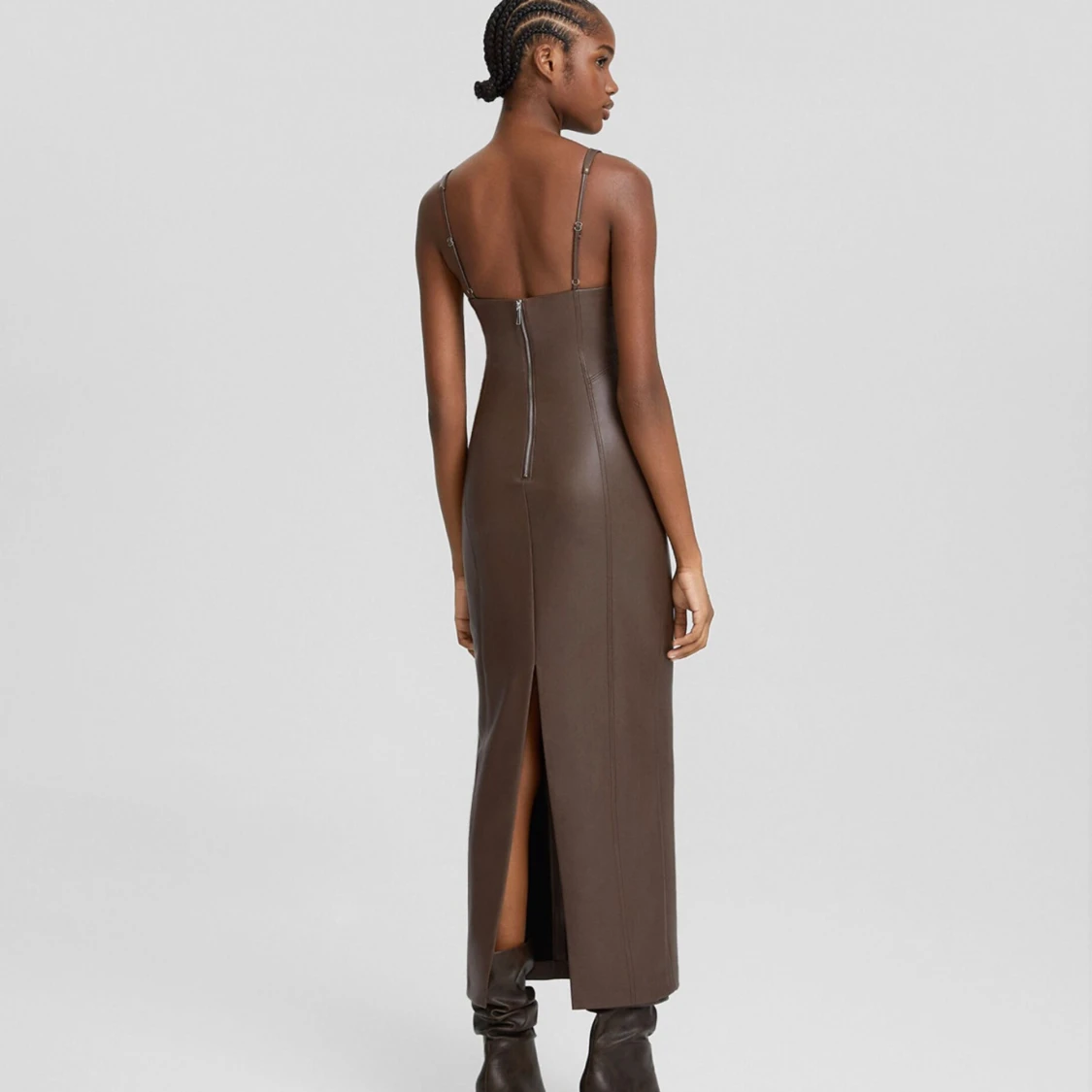 Brun långklänning i skinnimitation med smala axelband ❤️