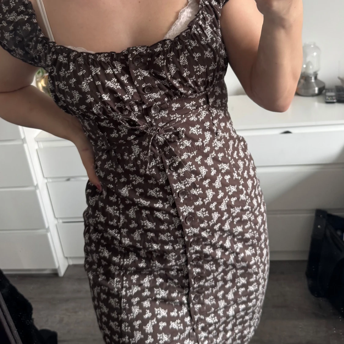 brun klänning med vita blommor och knytning framtill. (Katt och kanin finns i hemmet)