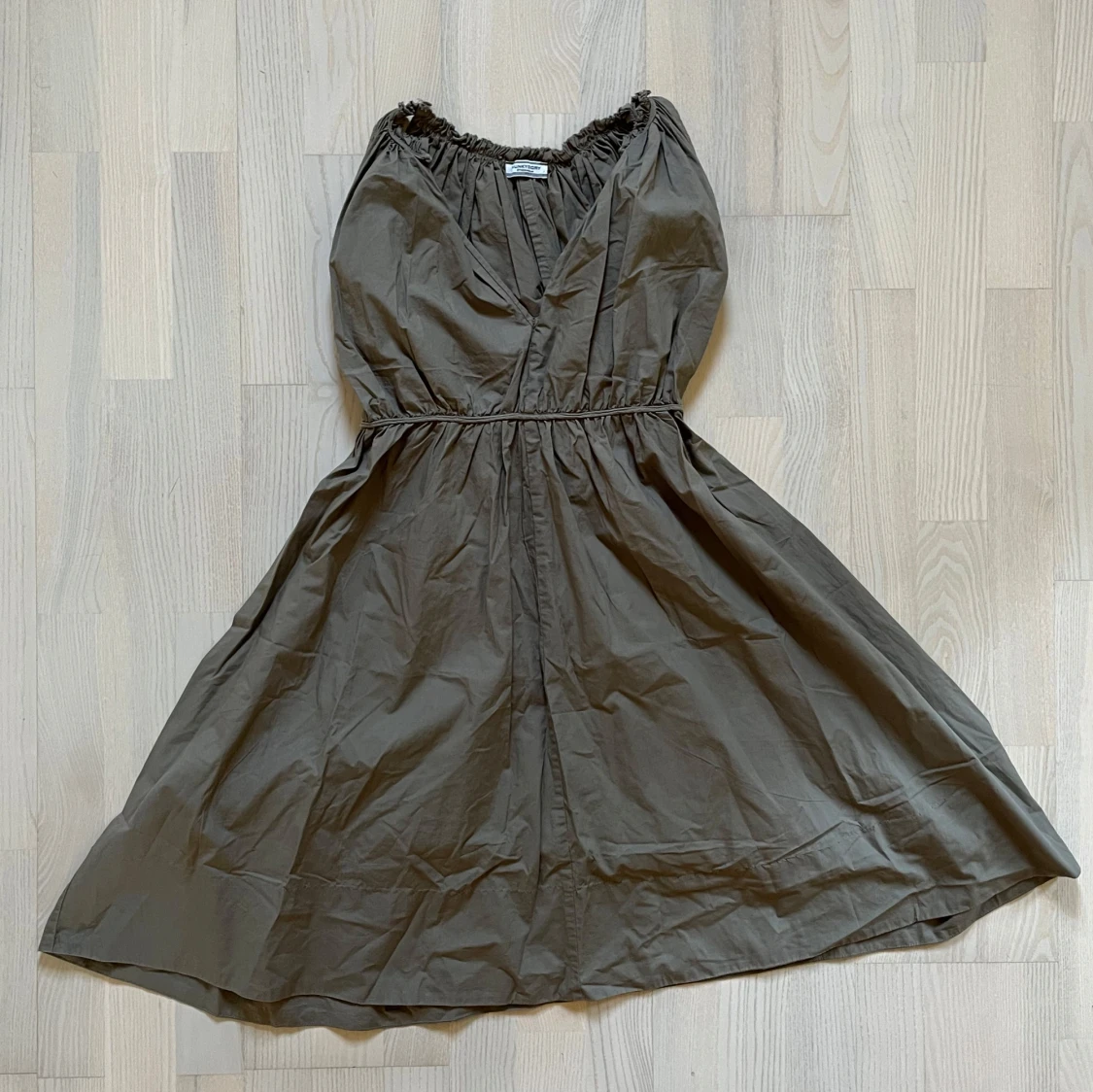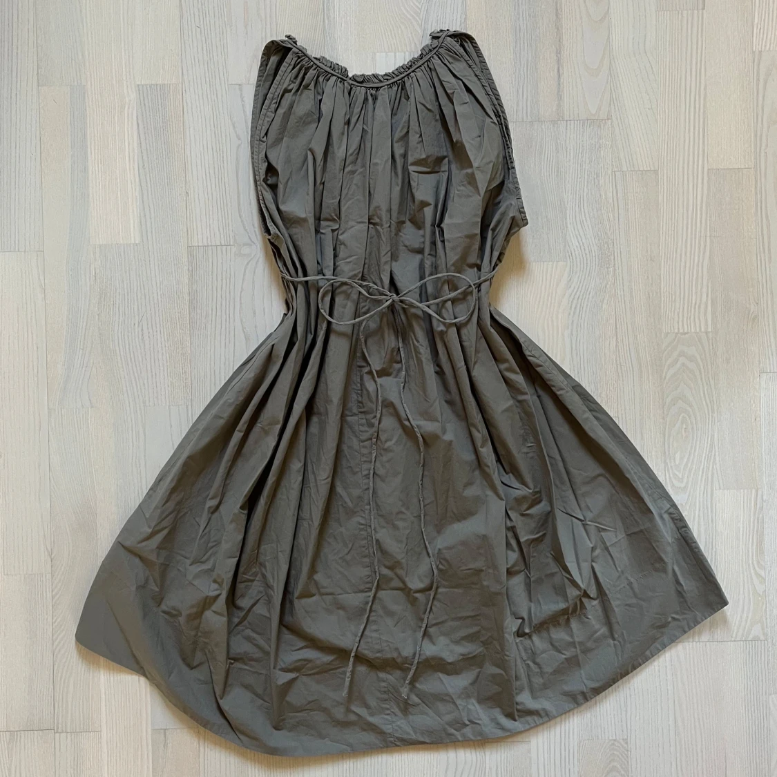 Mullvadsfärgad klänning i tunt, mjukt bomullstyg. Knyts i ryggen med snören som går strax under bysten, och räcker ungefär till knäna på mig (162 cm). Perfekt för en sommarutflykt, dag på stranden eller bara en tur på stan. Köptes på en loppis för några år sedan, men har aldrig används av mig - så i väldigt gott skick! Passar S och i lösare passform XS.