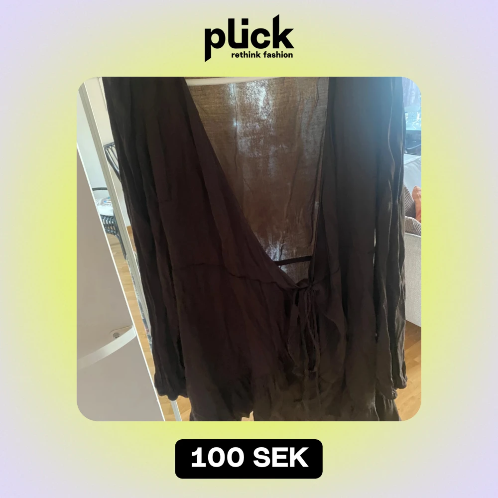 Säljer en brun klänning från Bik Bok i storlek L. Den har en djup v-ringning och långa ärmar o tunt material.