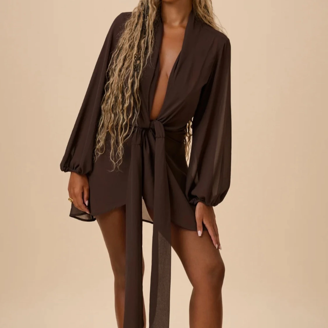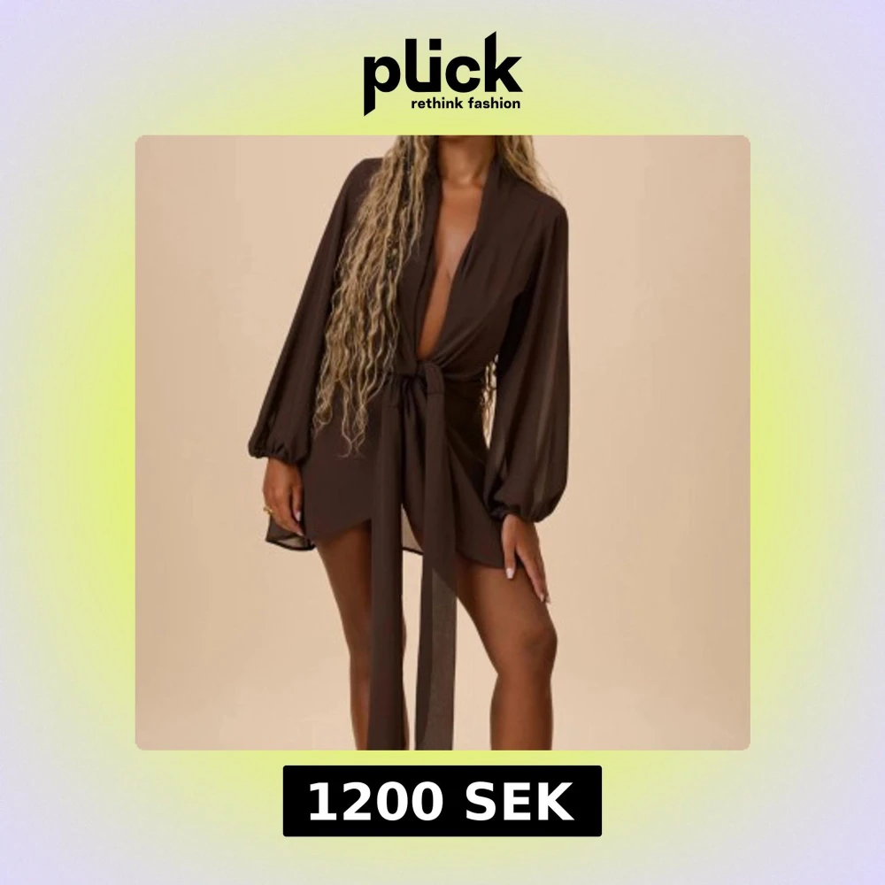 Snygg brun kort omlottklänning med djup v-ringning och långa, luftiga ärmar. Klänningen har ett brett knytband i midjan som ger en markerad siluett. Perfekt för dig som vill ha en trendig och chic look.