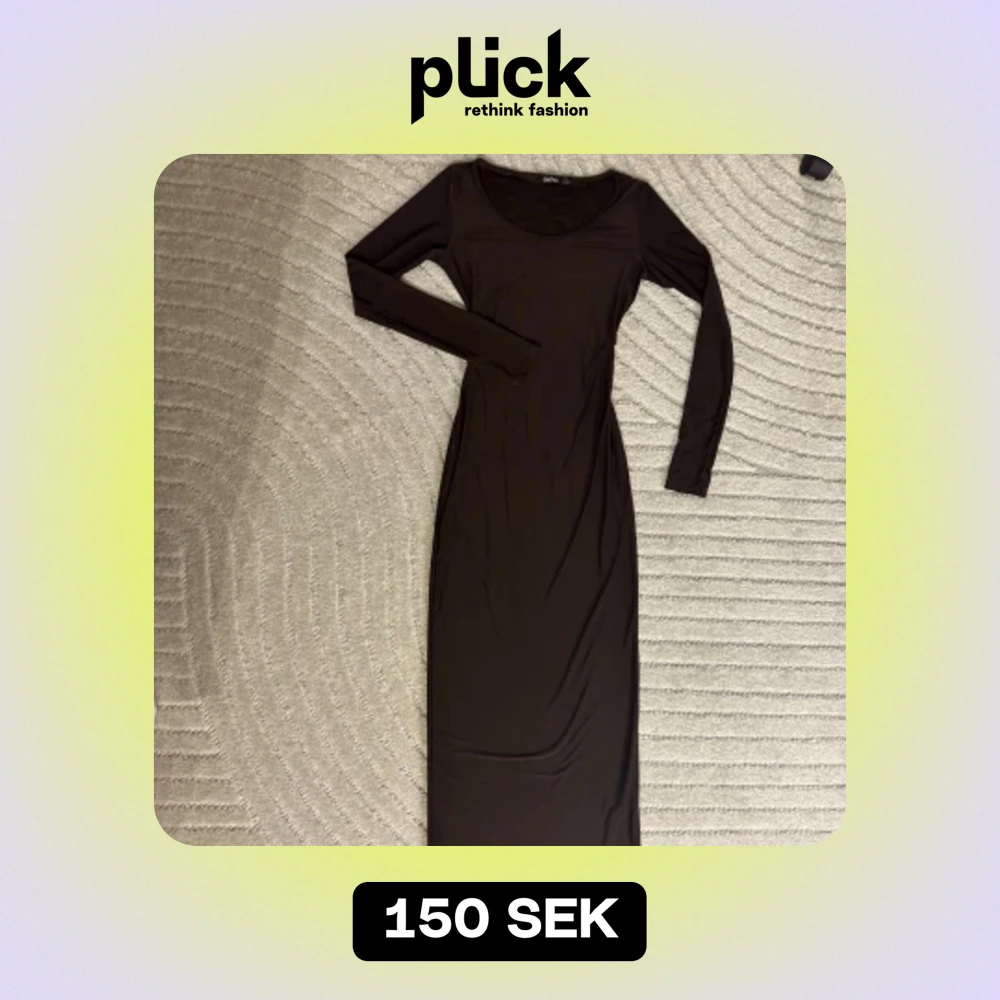 Jättefin brun maxiklänning som kramar om kroppen. Den är helt ny och oanvänd.