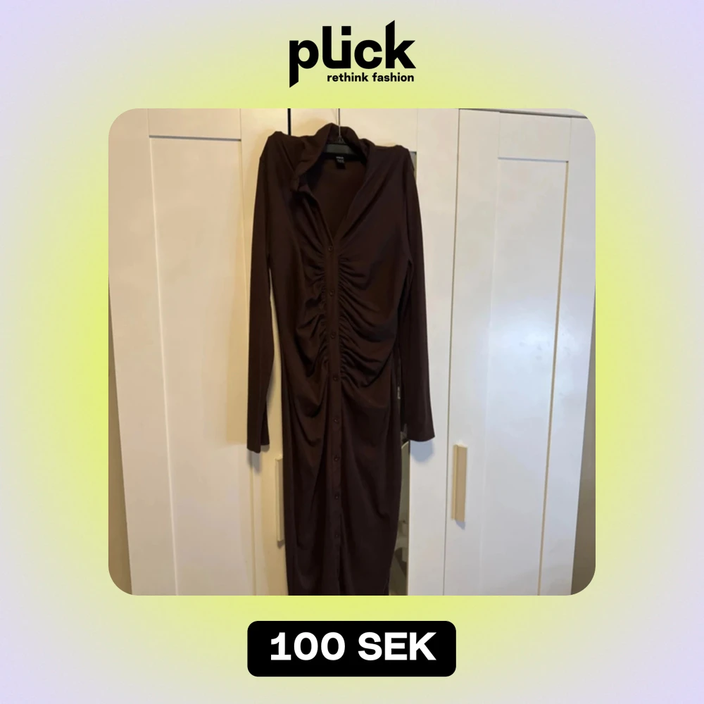 Snygg brun långklänning i mycket bra skick. Klänningen har långa ärmar och en cool rynkad detalj framtill som ger en unik look. Perfekt för höst och vinter, och kan kläs upp eller ner beroende på tillfälle. Materialet känns mjukt och bekvämt.