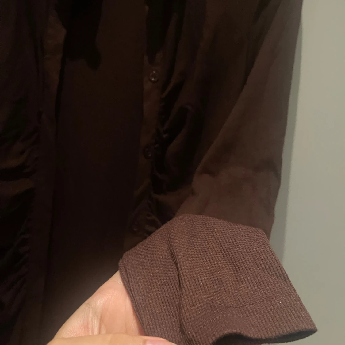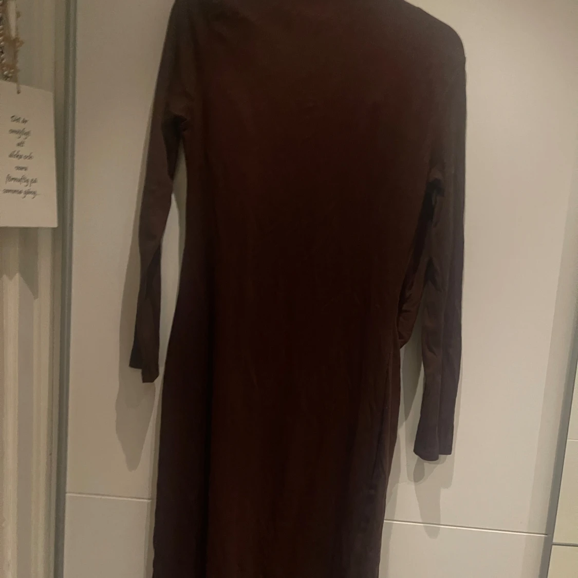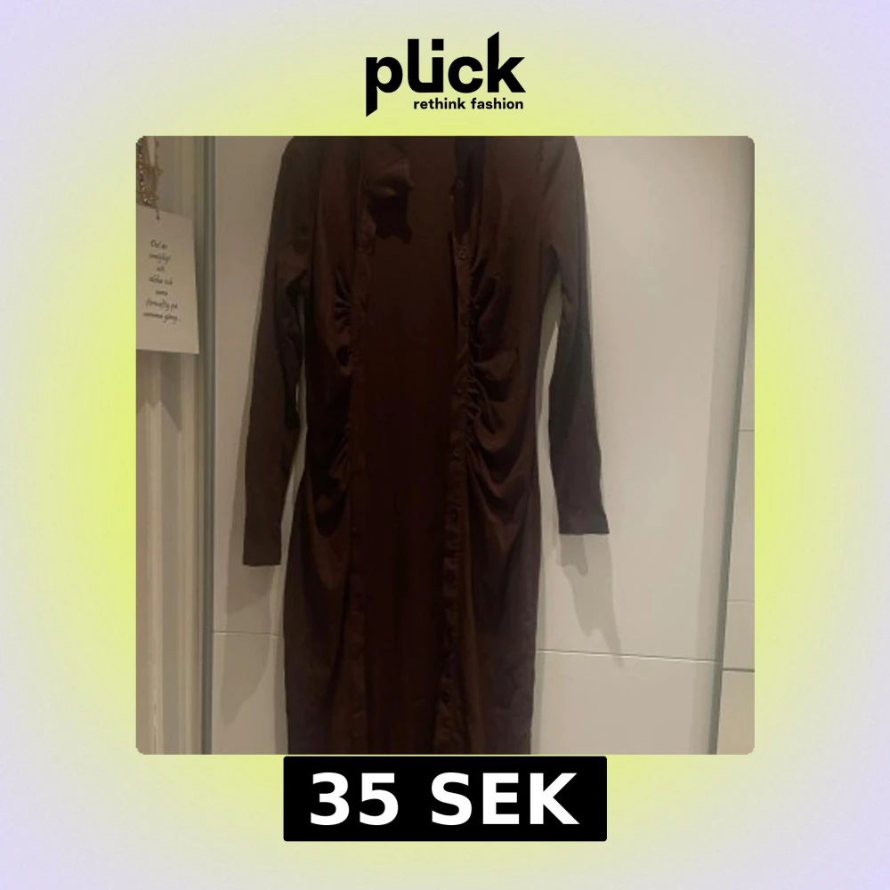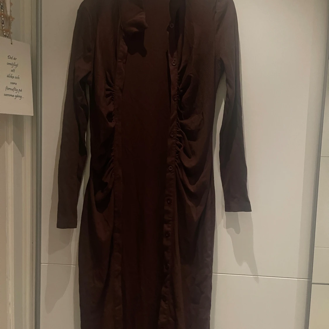 Säljer en brun långklänning från SHEIN i storlek L. Klänningen har långa ärmar, knappar framtill och snygga rynkade detaljer längs sidorna. Materialet är mjukt och stretchigt, perfekt för dig som gillar en enkel men stilren look.