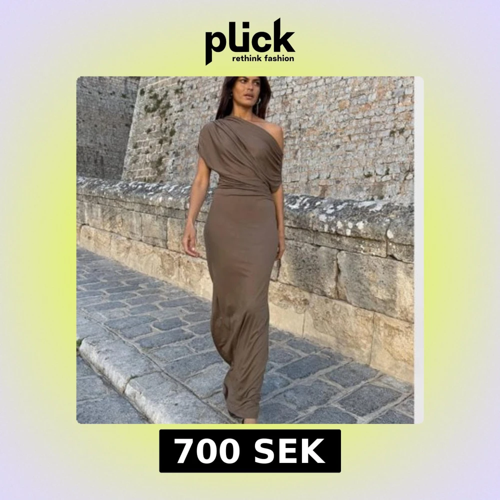 Snygg brun långklänning med oneshoulder och draperad överdel. Klänningen har tight passform, kort ärm och slits vid sidan. Tillverkad i mjukt stretchigt material som sitter skönt på kroppen och framhäver siluetten. Perfekt för fest och bröllop.