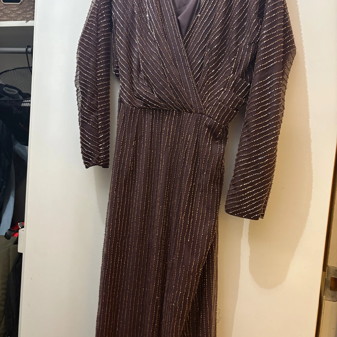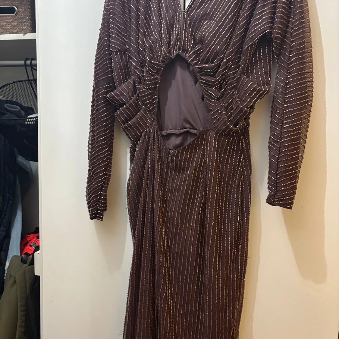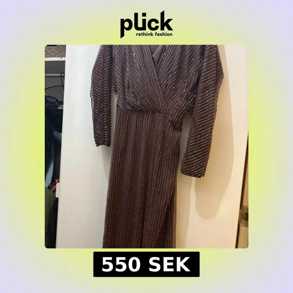 Säljer en brun långklänning med glittriga pärlor i rader över hela tyget. Klänningen har lång ärm, omlott upptill och en snygg cutout vid midjan. Materialet är mesh med pärldetaljer som ger en lyxig känsla. Perfekt för dig som vill sticka ut med coola detaljer.