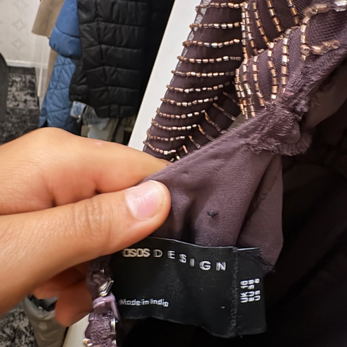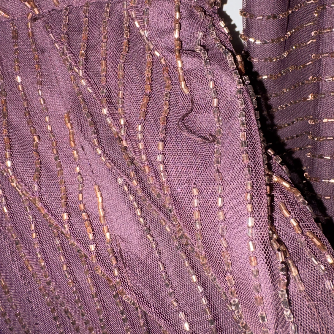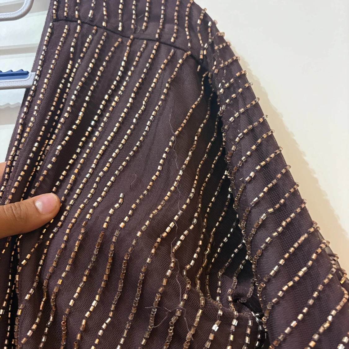 Säljer en brun långklänning med glittriga pärlor i rader över hela tyget. Klänningen har lång ärm, omlott upptill och en snygg cutout vid midjan. Materialet är mesh med pärldetaljer som ger en lyxig känsla. Perfekt för dig som vill sticka ut med coola detaljer.