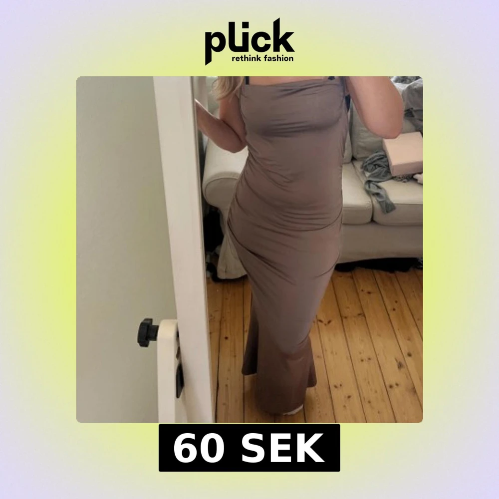 Säljer en elegant brun långklänning med smala axelband och figurnära passform. Klänningen har en stilren, minimalistisk design och är tillverkad i ett mjukt, stretchigt material som sitter snyggt mot kroppen.