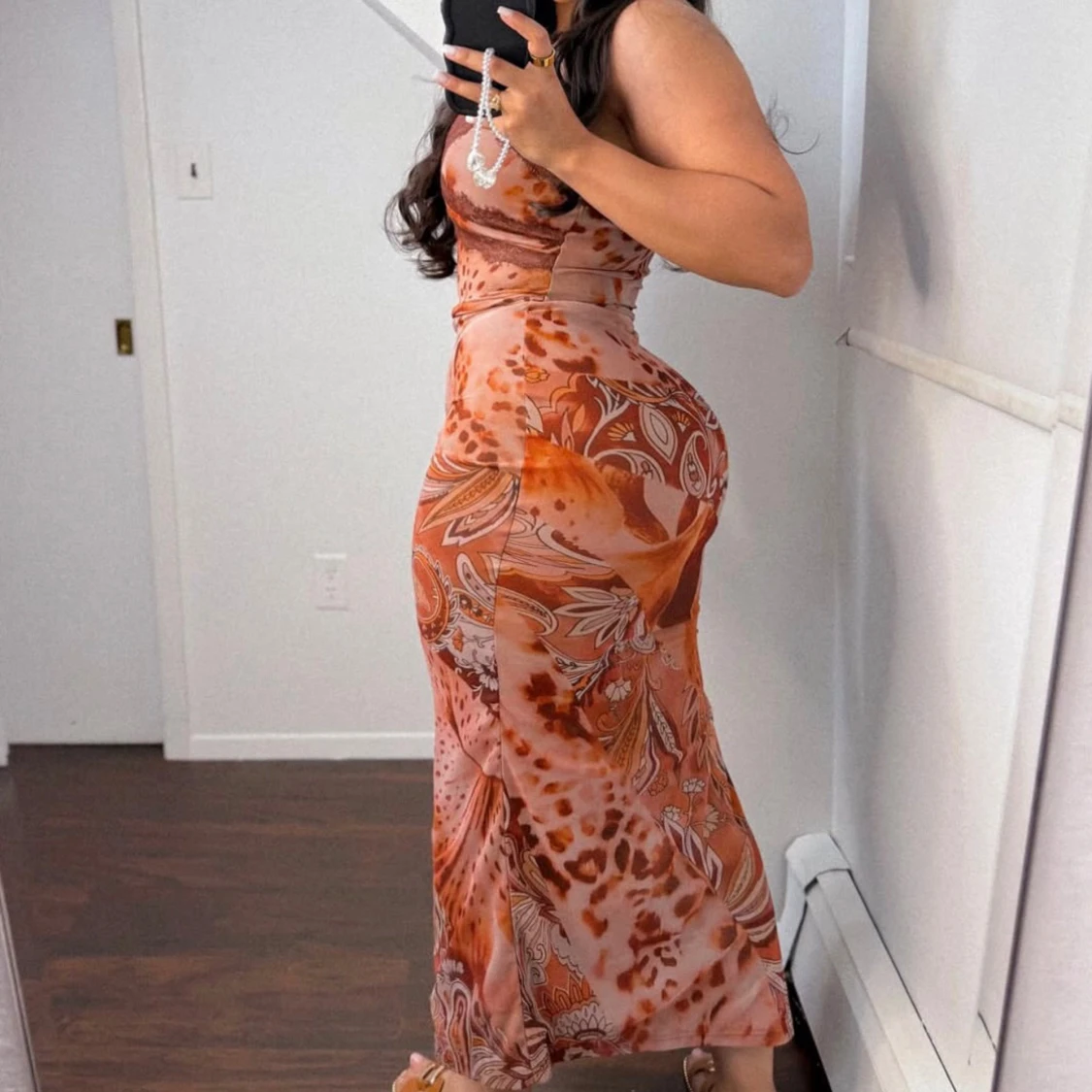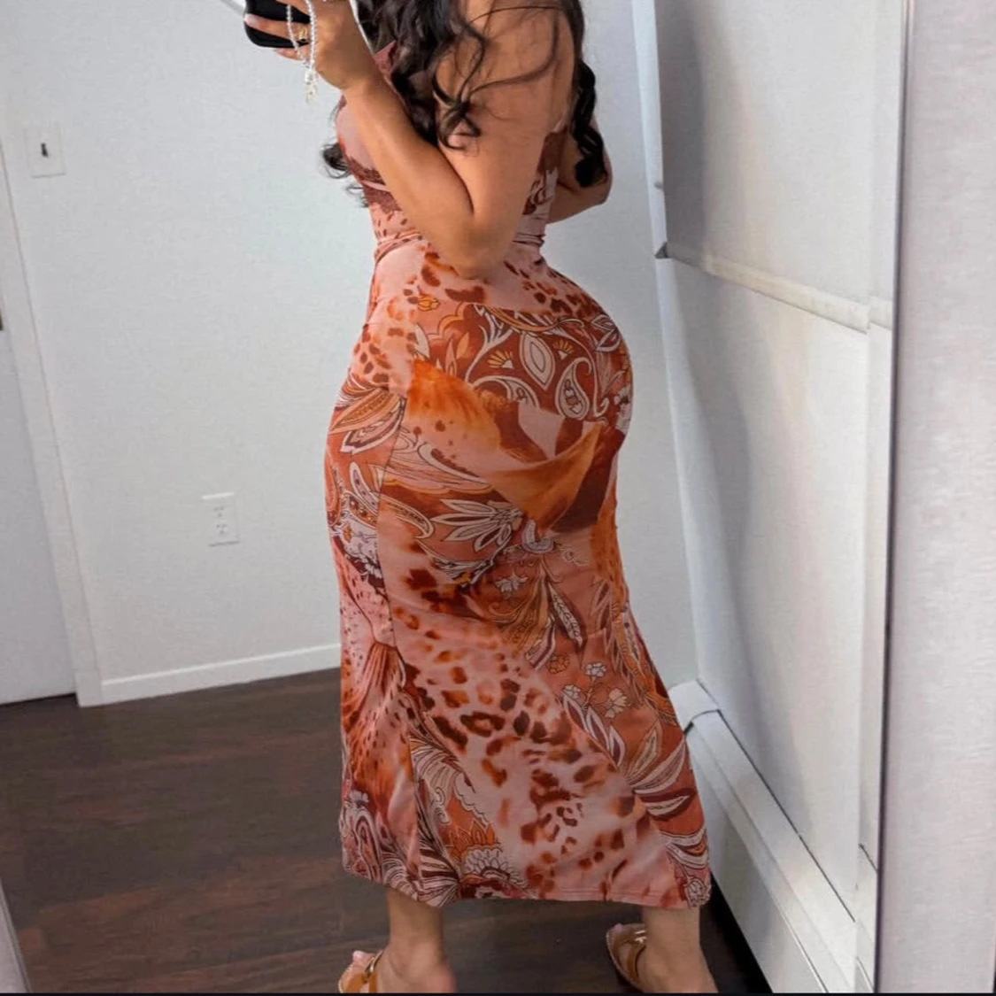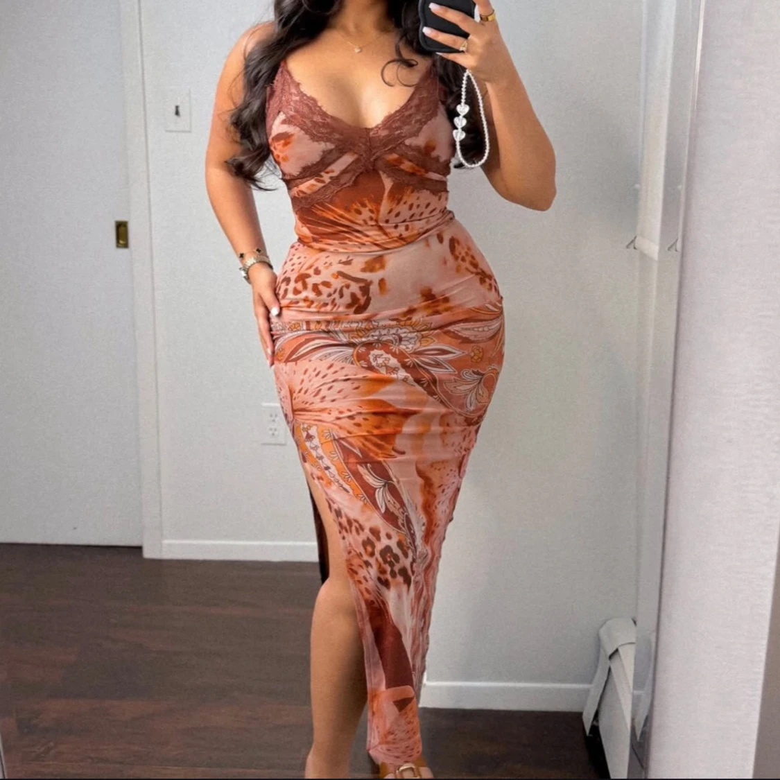 Säljer en snygg långklänning i bruna och beige toner med leopard- och paisleymönster. Klänningen har smala axelband, v-ringning med spetsdetalj och en hög slits på sidan. Figurnära passform och mjukt, stretchigt material som sitter perfekt.
