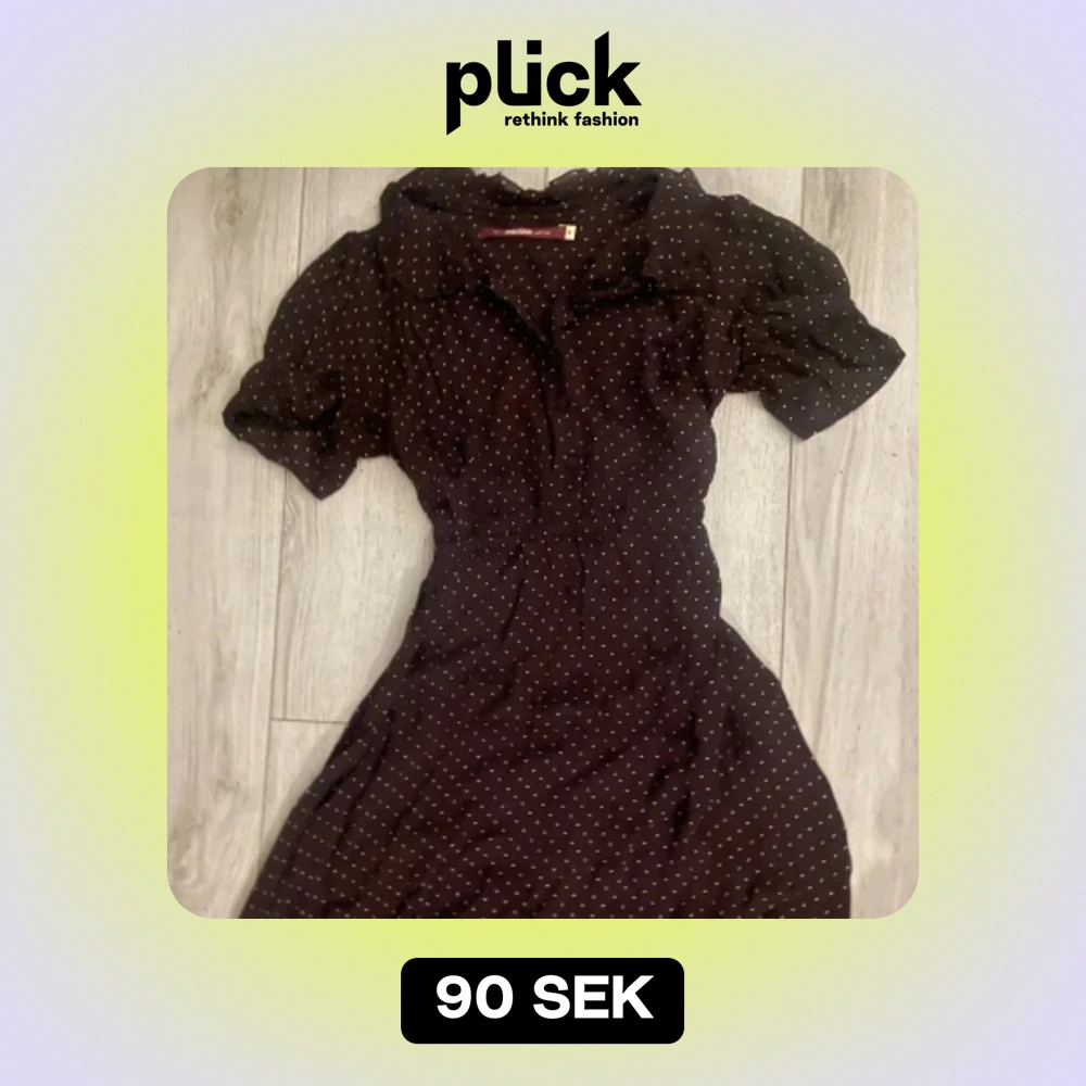 Säljer en superfin mörkbrun klänning med små vita prickar från Indiska. Den har korta ärmar och en söt volangdetalj längst ner. Perfekt för både vardag och fest!