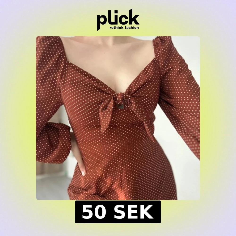 Superfin brun klänning med vita prickar, v-ringad och knyt framtill. Långa puffärmar och figurnära passform upptill, lätt utsvängd nertill. Perfekt för dig som gillar retrovibbar och söta detaljer. Passar S/M