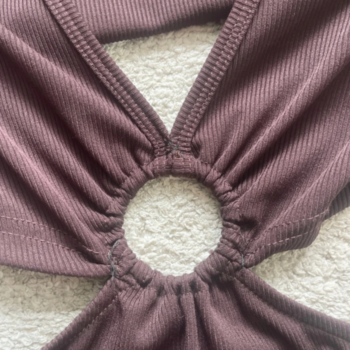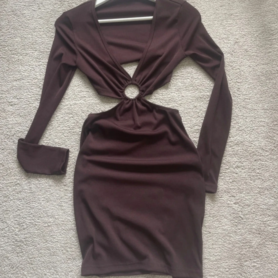 Brun ribbad klänning. Jag har sytt förhand runt cirkeln i mitten, se bild 3. Detta för att stabilisera bysten. Går att sprätta upp