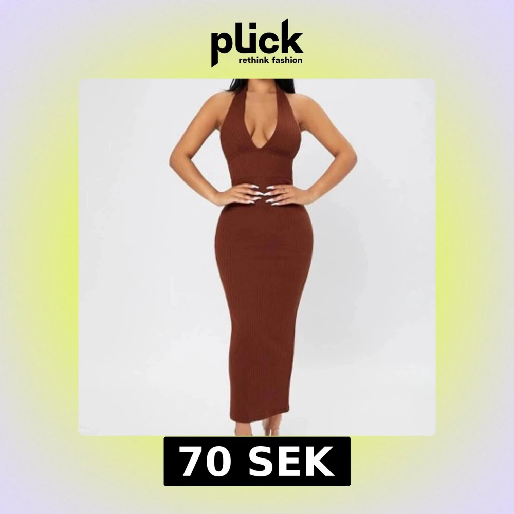 Snygg brun ribbad klänning med djup v-ringning och öppen rygg. Klänningen är ärmlös och har en tight passform som framhäver figuren. Perfekt för en stilren och elegant look. Endast använd 1 gång 💗